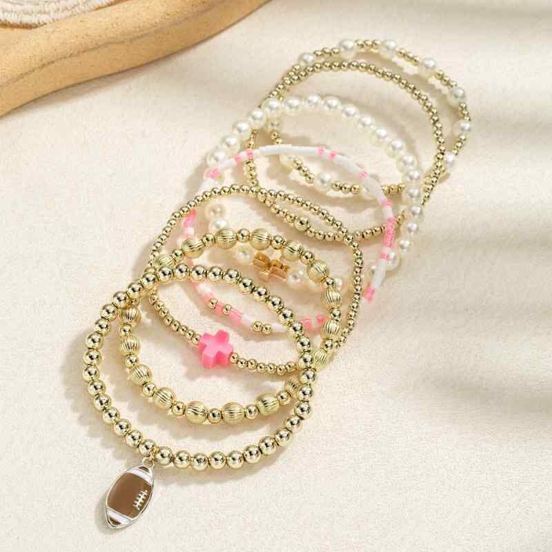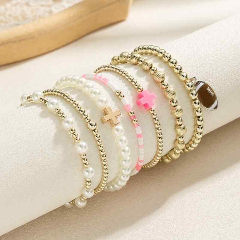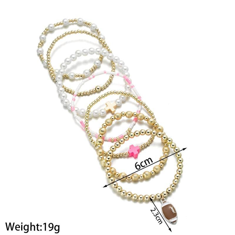 ブレスレット レディース 合金 ミックス素材 ビーズ 伸縮性 編み込み ラグビーボールモチーフ クロス 幾何学柄 7点セット スタイリッシュ シンプル 個性的 カジュアル 普段使い