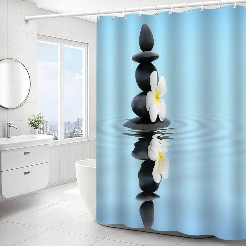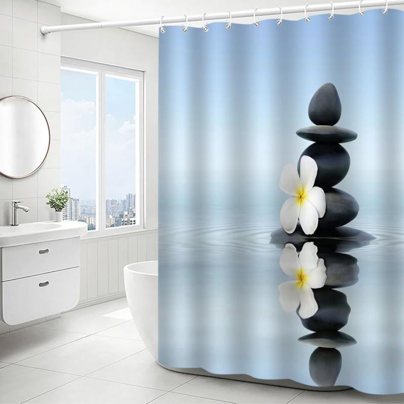 シャワーカーテン 禅風 和モダン 3Dデジタルプリント 防水 防カビ ポリエステル 浴室用 自然石デザイン 突っ張り棒対応 穴あけ不要 洗える