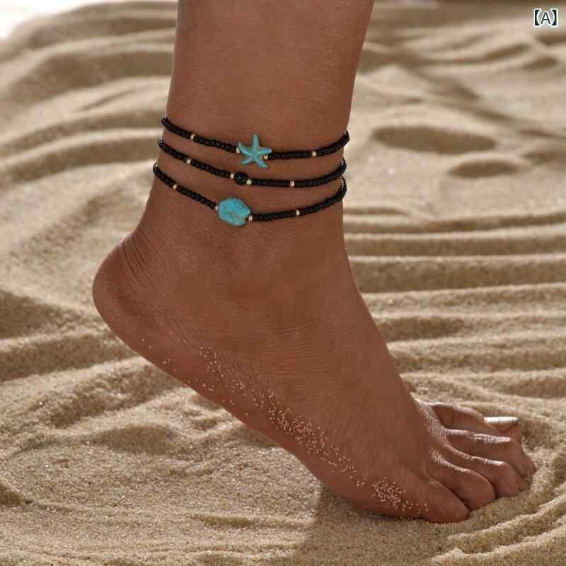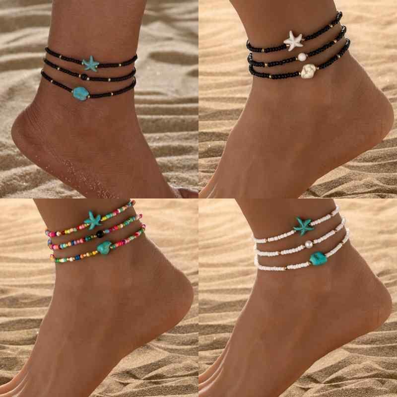 アンクレット レディース 女性用 ボヘミアン エスニック リゾートスタイル ターコイズ ヒトデ ビーズ プラスチック 樹脂 不規則 伸縮性 幾何学模様 3点セット ビーチ サマー カジュアル 足首アクセサリー