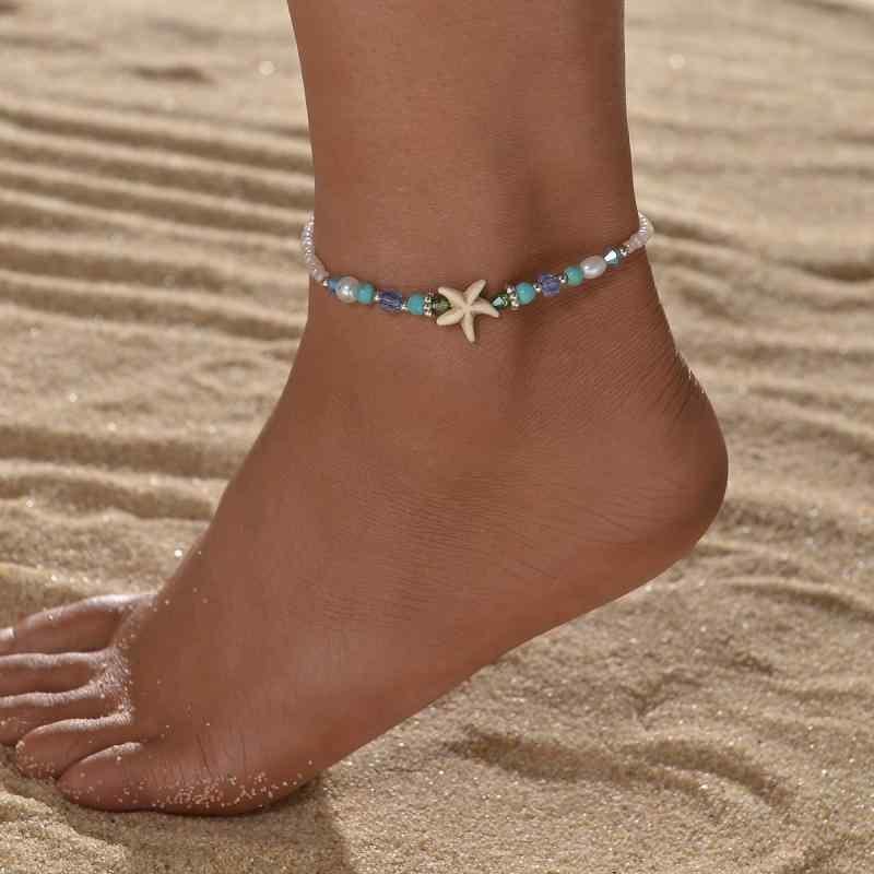 アンクレット レディース 女性用 ターコイズ ヒトデ フェイククリスタル パール ビーズ 伸縮性 大人女子 幾何学模様 普段使い リゾート 夏