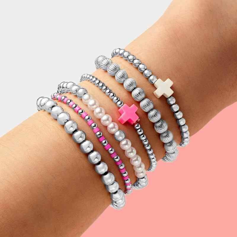 ブレスレット レディース 女性用 6点セット クロスモチーフ パール レジン ポリマークレイ ビーズ 伸縮性 ゴムブレスレット 幾何学模様 個性的 おしゃれ 欧米風 カジュアル 普段使い きれいめ アクセント 電気メッキ加工