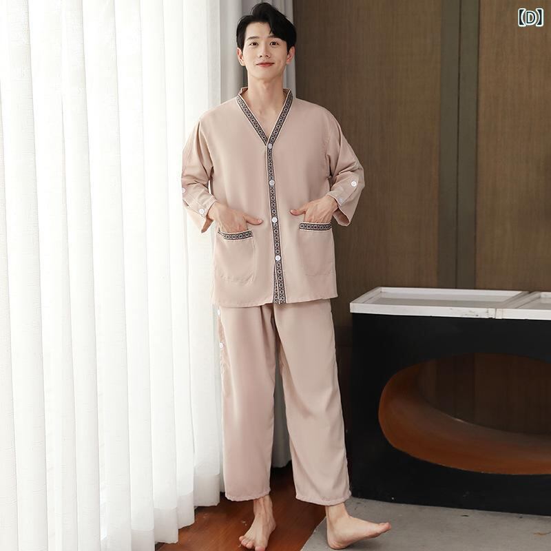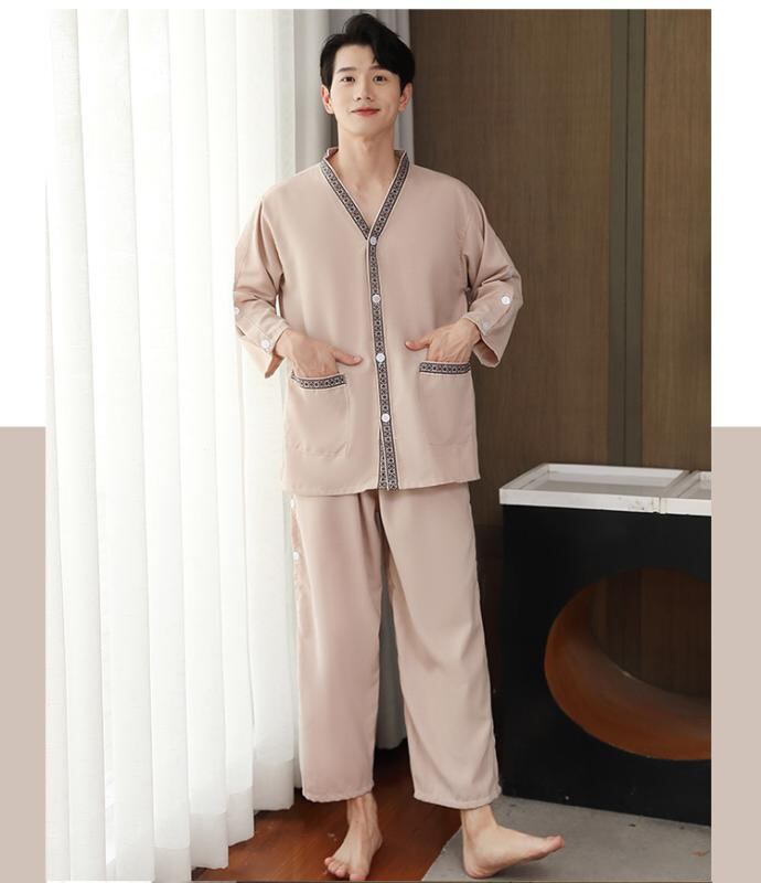 パジャマ ルームウェア 男女兼用 綿麻混 ロング丈 前開き 上下セット サウナウェア 施術着 ゆったり 大きいサイズ 足つぼ 耳かき リラックス