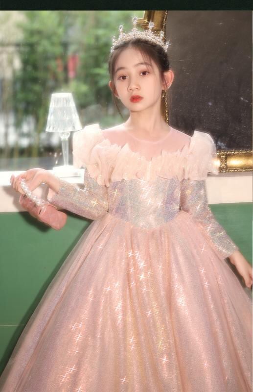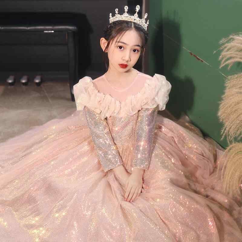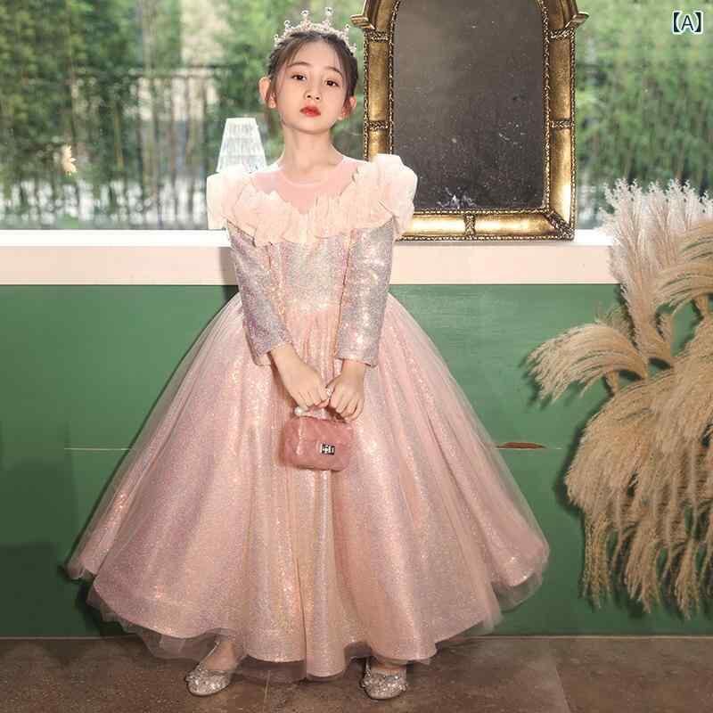 キッズ ドレス 女児 子供用 ジュニア プリンセス 高級感 エレガント 上品 誕生日 発表会 ピアノ演奏会 ステージ イベント フォーマル ロング丈 ピンク ブルー パーティー 結婚式 記念撮影 かわいい