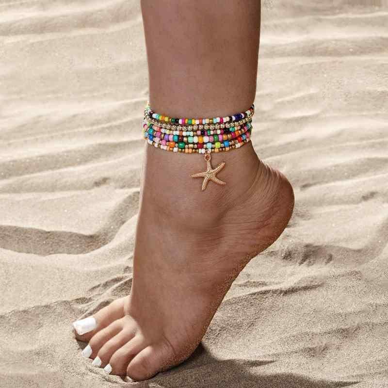 アンクレット レディース ボヘミアン マリンスタイル 合金 ヒトデモチーフ 樹脂ビーズ 伸縮性 カジュアル ビーチ リゾート 重ね付け 6点セット