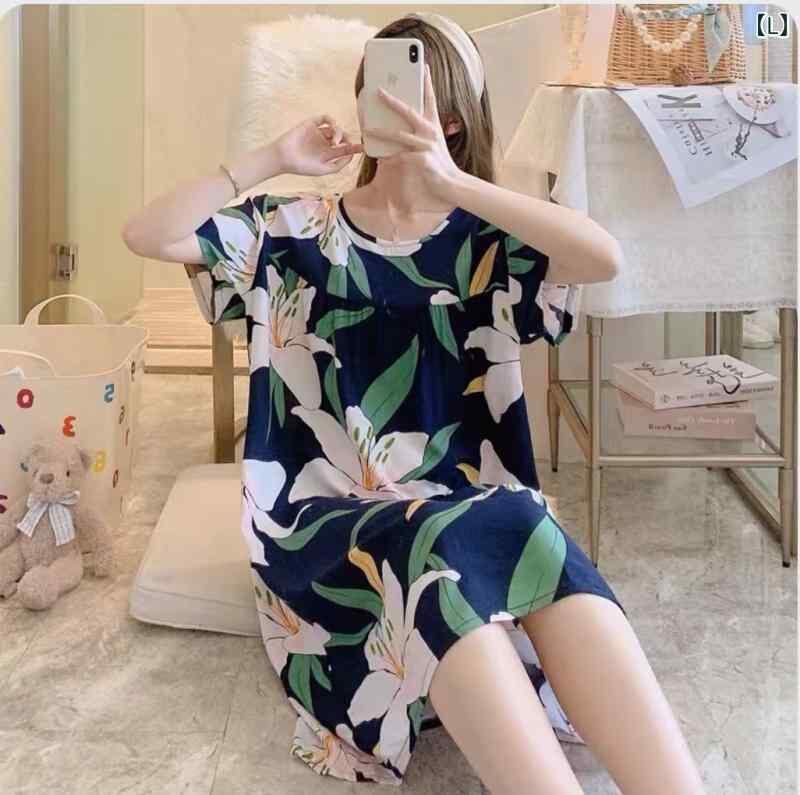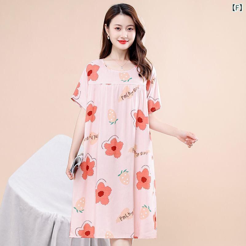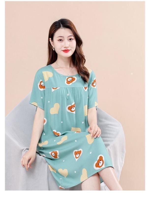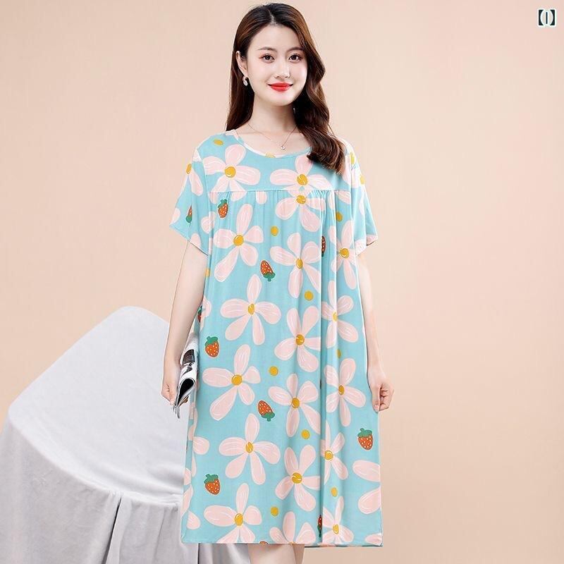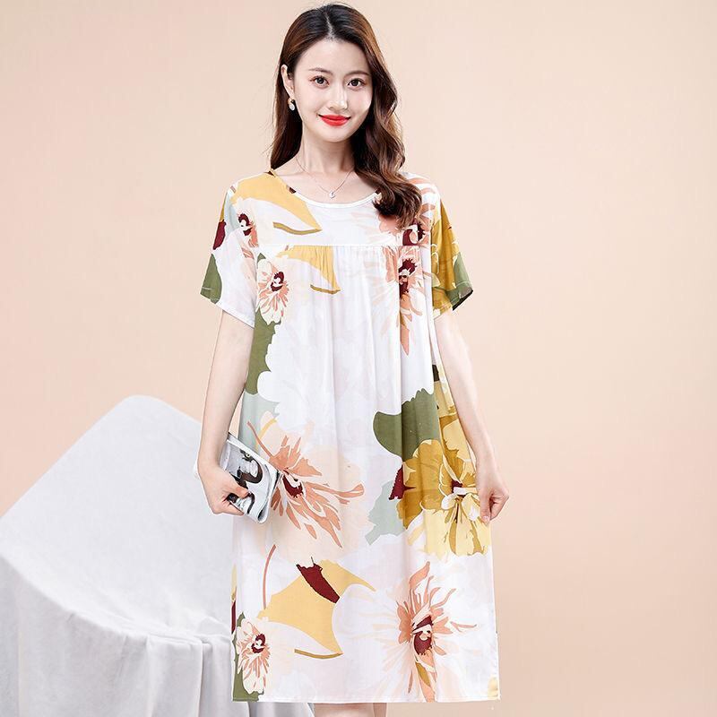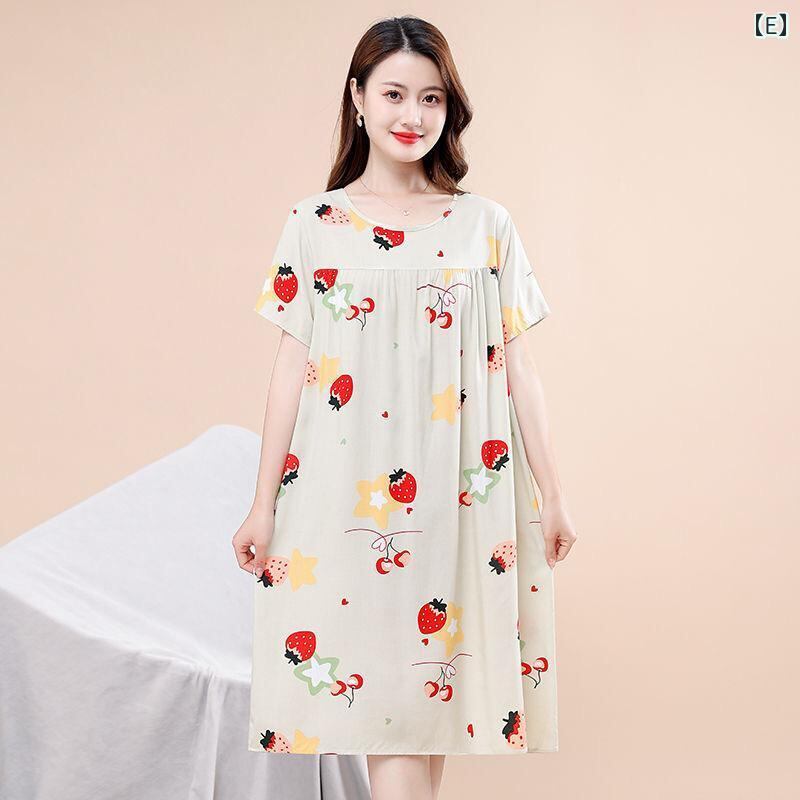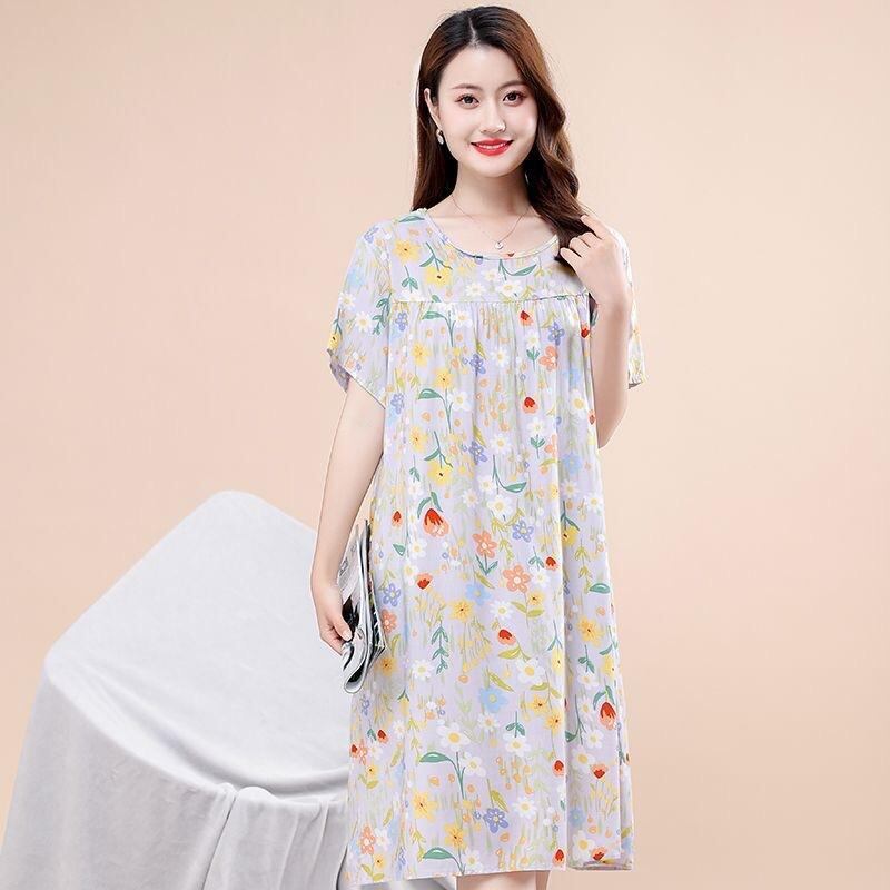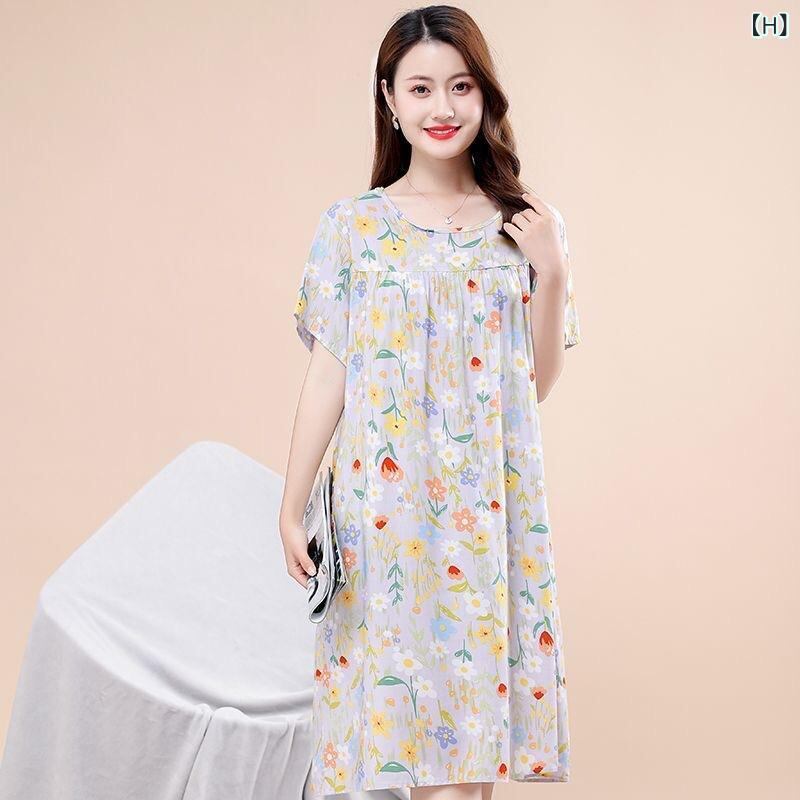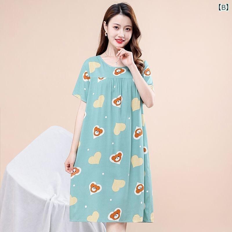 レディース ルームウェア パジャマワンピース 半袖 薄手 綿混 ラウンドネック ゆったり 大きいサイズ ミディ丈 夏 部屋着 ネグリジェ ルームワンピース かわいい リラックスウェア