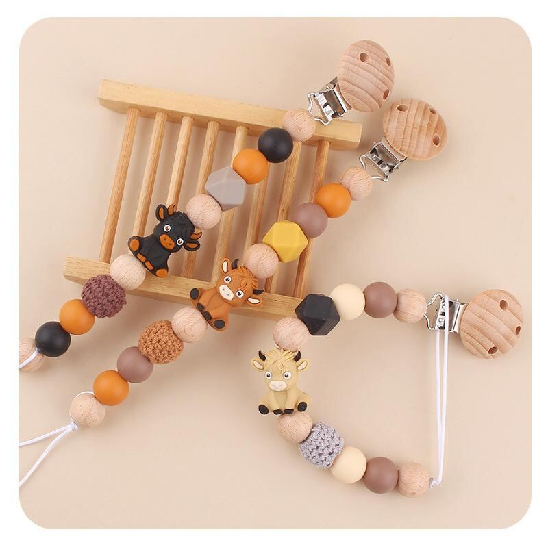 ベビー用品 赤ちゃん ベビー おしゃぶりクリップ おしゃぶりホルダー 歯固め シリコン ブナ材 天然木 落下防止 紛失防止 かわいい おしゃれ 牛モチーフ 立体 動物キャラクター 安全安心 出産祝い ギフト プレゼント