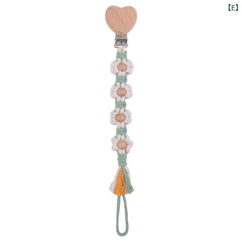 ベビー用品 乳幼児用 おしゃぶりクリップ 落下防止チェーン かわいい ハート柄 ブナ材 手作り フラワーモチーフ 編み込み コットンロープ カラフル