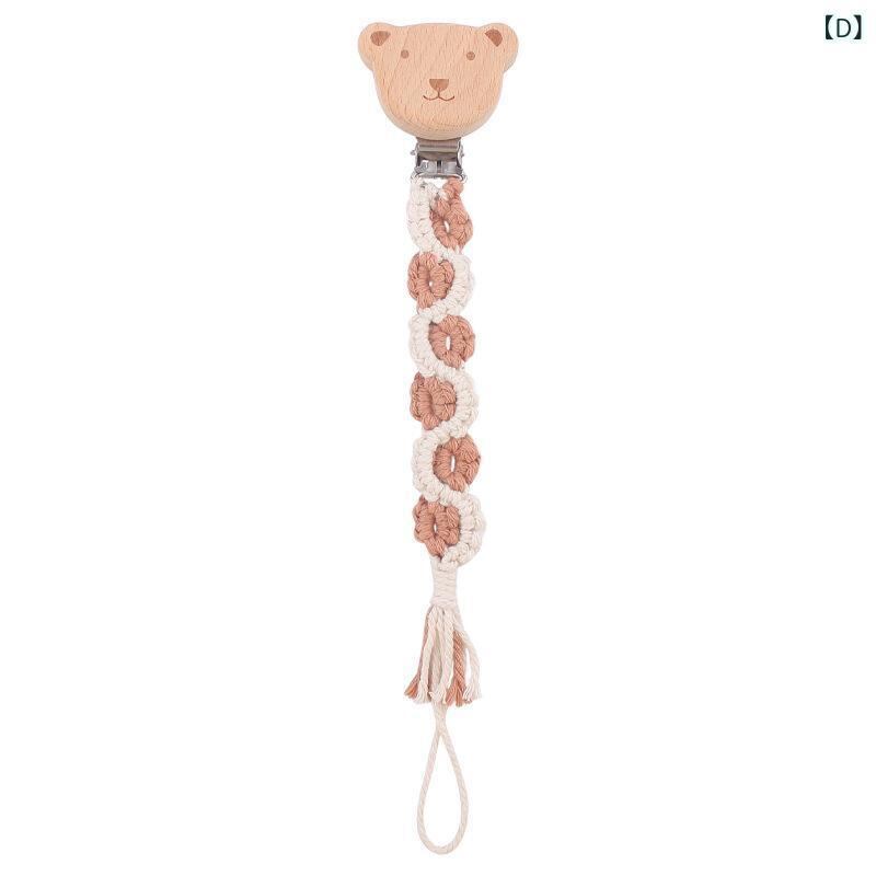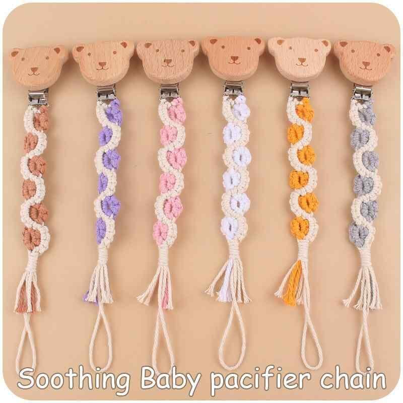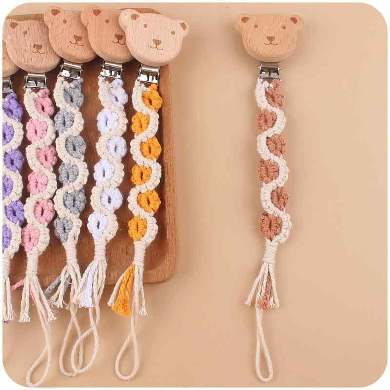 ベビー用 おしゃぶりホルダー ストラップ クマモチーフ ブナ材 コットン 編み込み 手作り 紛失防止 安心アイテム アイボリー ピンク グリーン グレー カラフル