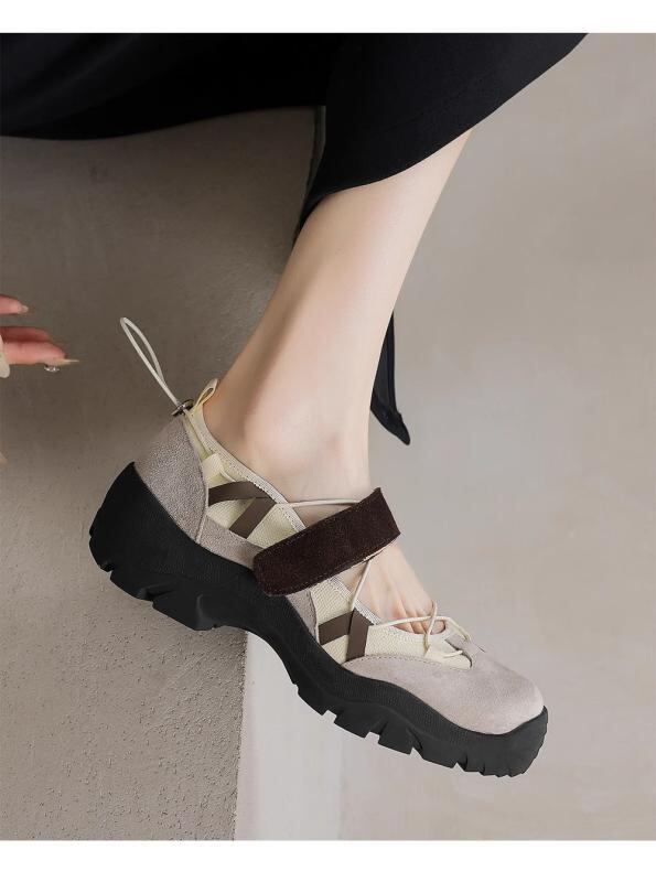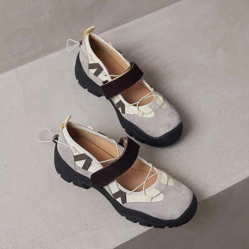 マリジェーンシューズ レディース 厚底 太ヒール 牛革 本革 配色切り替え レトロ くり抜きデザイン 面ファスナー ラウンドトゥ 機能的 普段使い オールシーズン対応 カジュアル ダークグレー ホワイトグレー