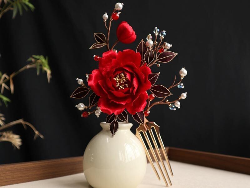髪飾り レディース ブライダル フラワー コーム 赤色 ベルベット 結婚式 花嫁 婚礼 ヘッドドレス 和装 まとめ髪 アップヘア 高級感 手作り レトロ