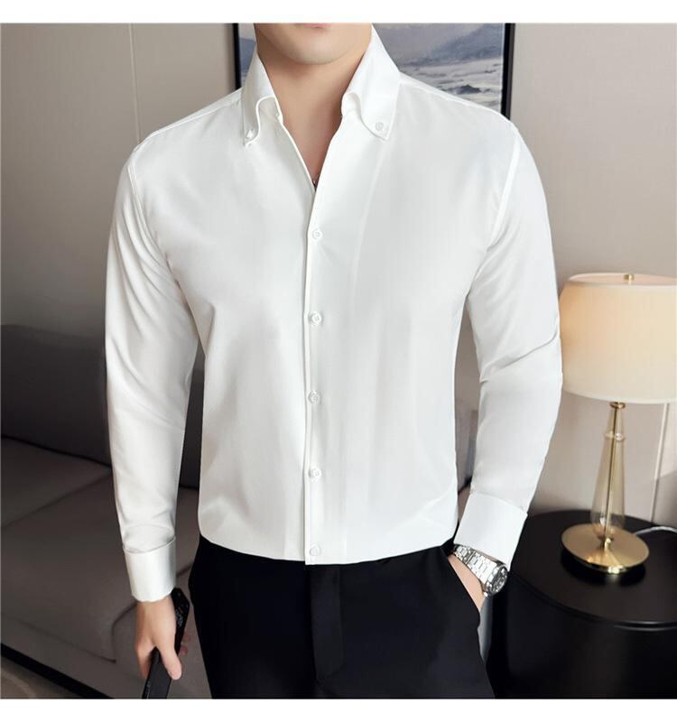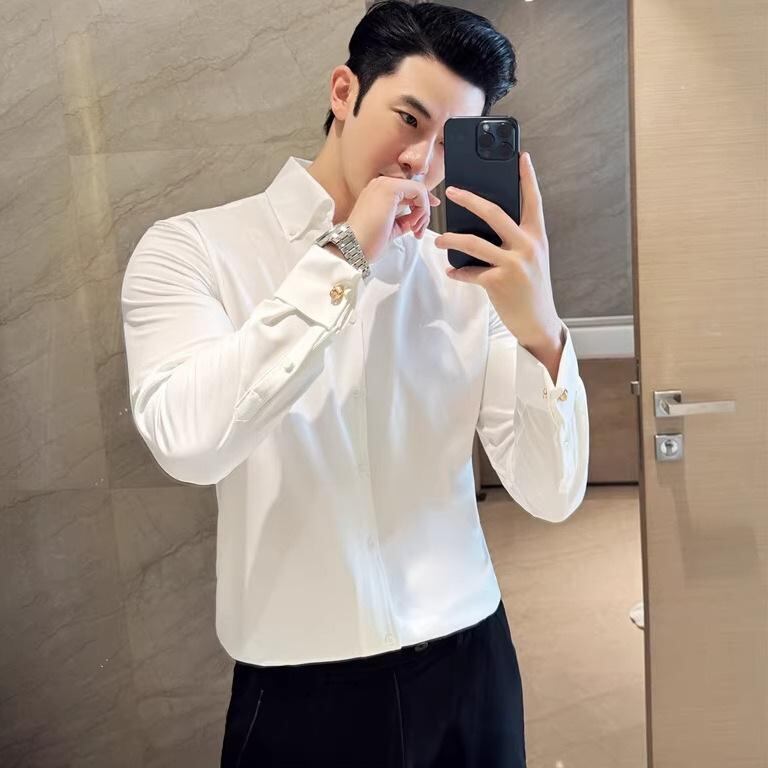 シャツ メンズ 男性用 秋 Vネック 長袖 トップス フレンチスタイル スリムフィット ストレッチ ドレープ感 ポリエステル混紡 イージーケア カジュアル カフス仕様 白 黒 ブルー