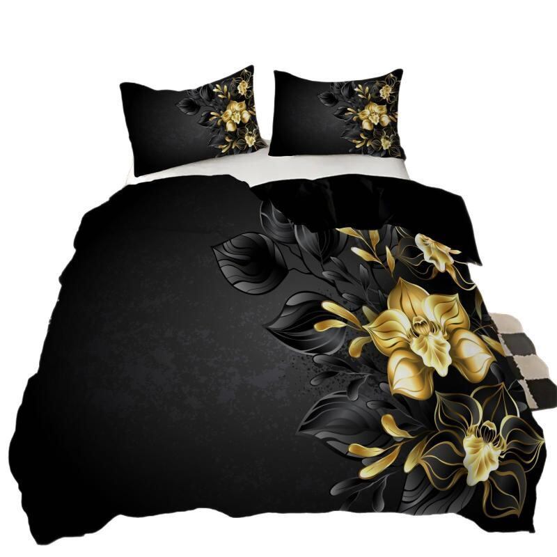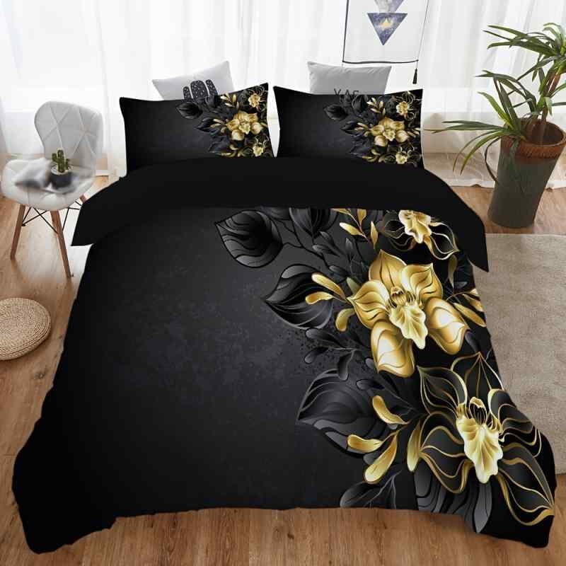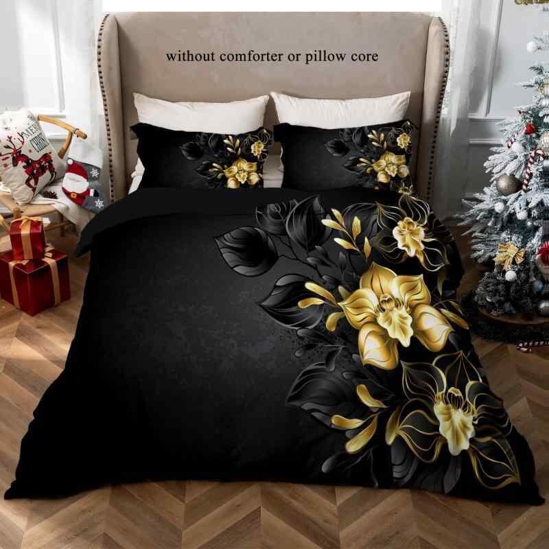 寝具セット 3点セット 掛け布団カバー 枕カバー 金色の蘭 花柄 田園風 3Dデジタルプリント 北欧風 磨毛加工 ベッドスプレッドタイプ 化繊 おしゃれ シック
