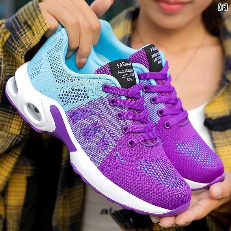 スニーカー レディース カジュアル スポーツシューズ 大きいサイズ メッシュ 通気性 軽量 エアクッション レースアップ ラウンドトゥ フラットソール ローカット 普段使い バイカラー ブラック パープル 春夏