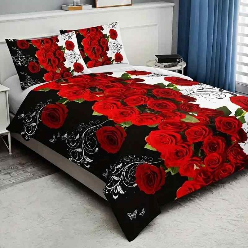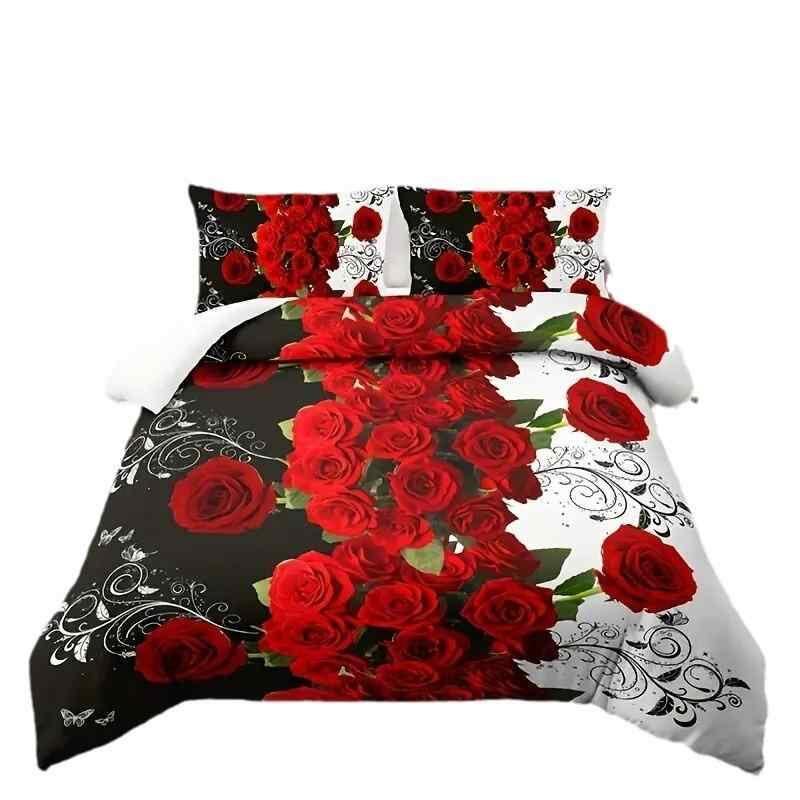 布団カバーセット ロマンティック 赤いバラ 花柄 デジタルプリント 北欧風 3点セット 掛け布団カバー ピローケース 寝具 ベッドカバー 化繊