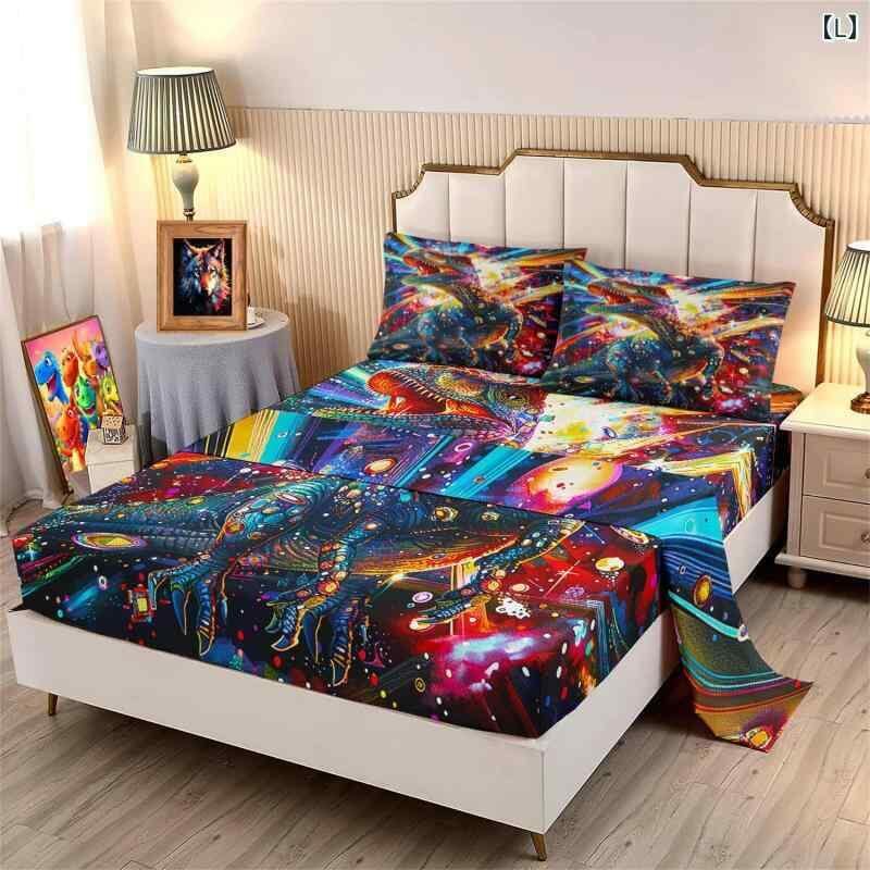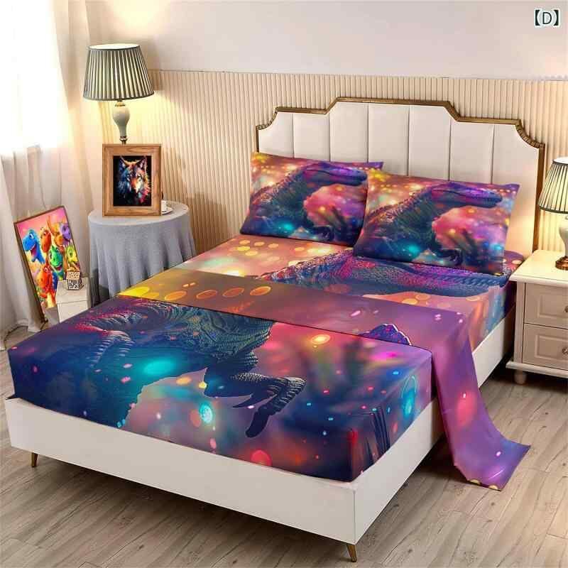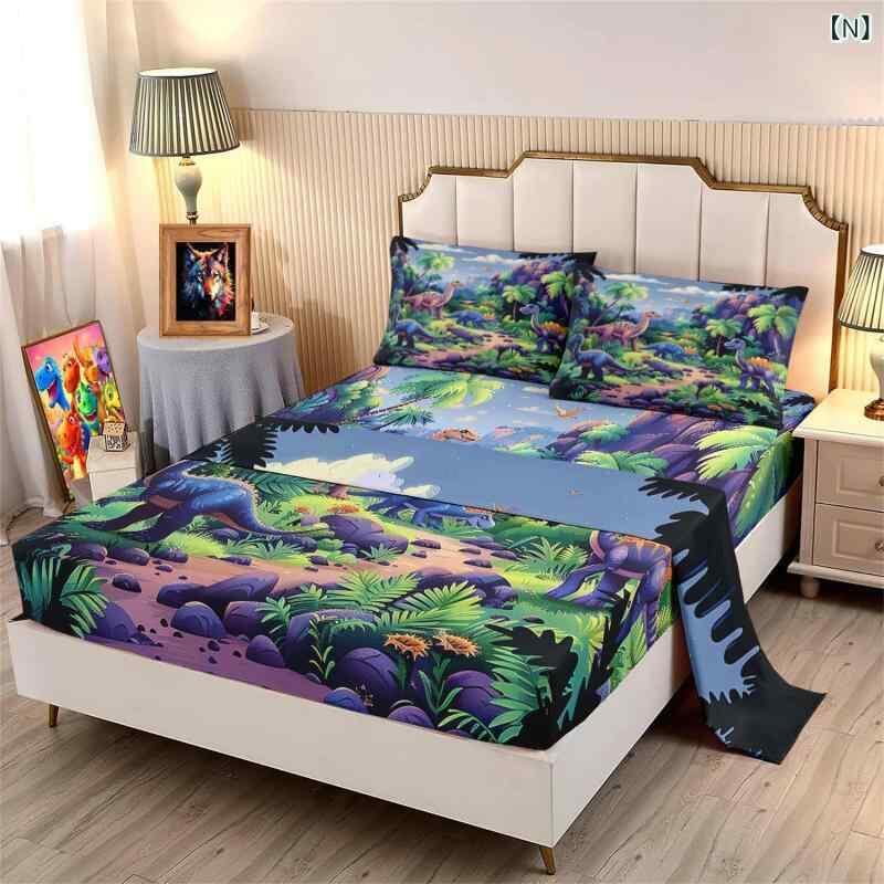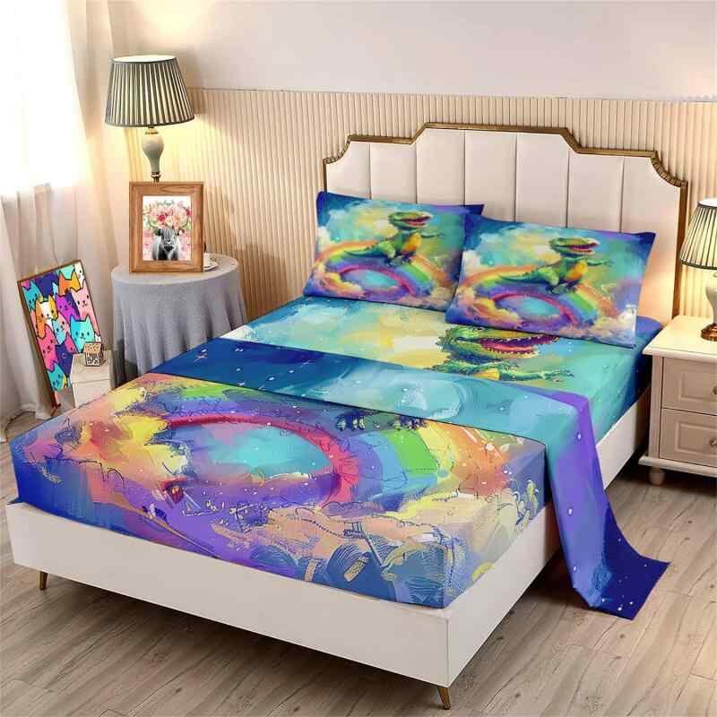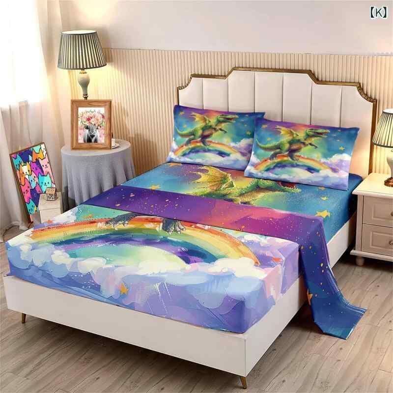 寝具カバー4点セット カートゥーン レインボー 恐竜柄 フィットシーツ マイクロファイバー 寝室 寮 子供部屋 ベッドリネン