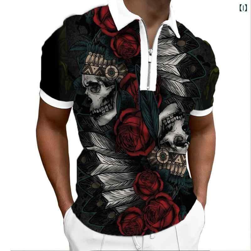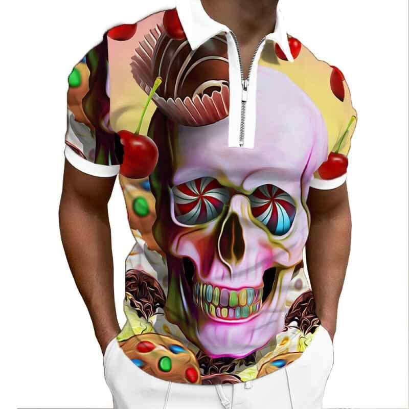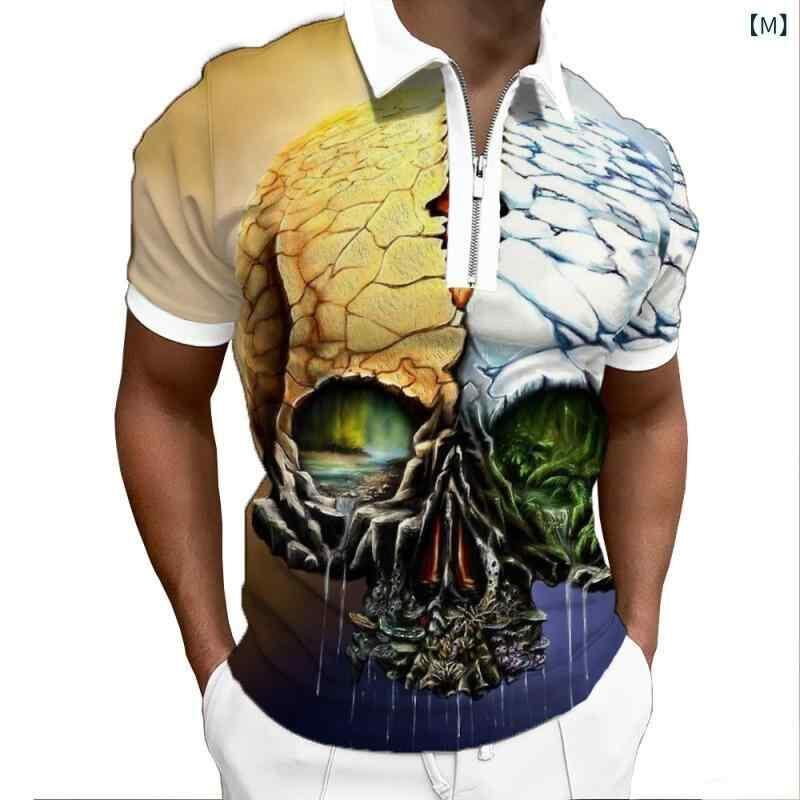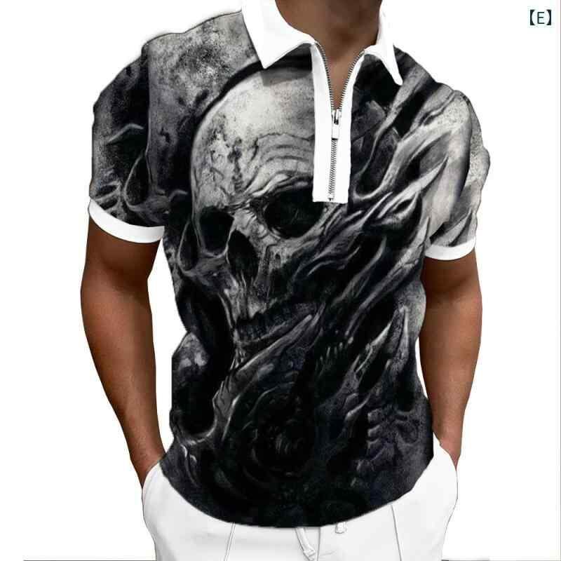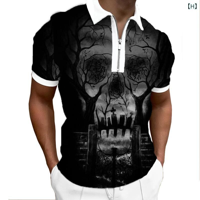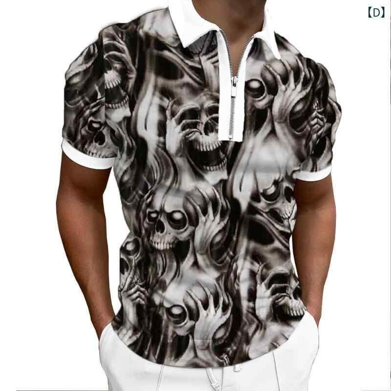 POLOシャツ 男性用 半袖 襟付き スカル柄 3Dプリント ジップアップ ポリエステル混紡 カジュアル 夏物 トップス 普段使い