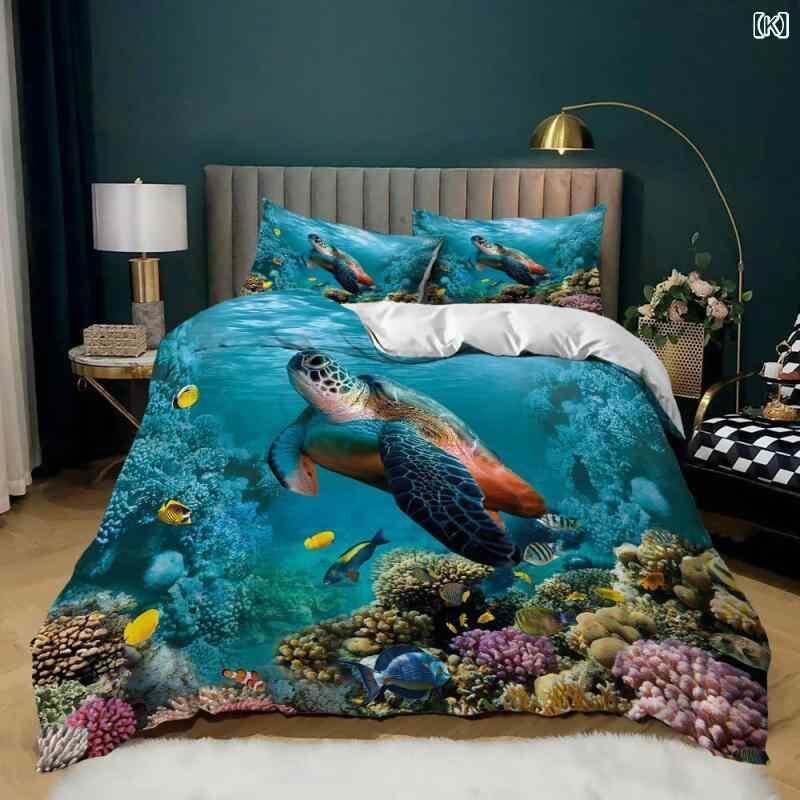 寝具 布団カバーセット 3点セット 海洋 ウミガメ 動物 アニマル カートゥーン デジタルプリント ホワイト ポリエステル 掛け布団カバー 枕カバー
