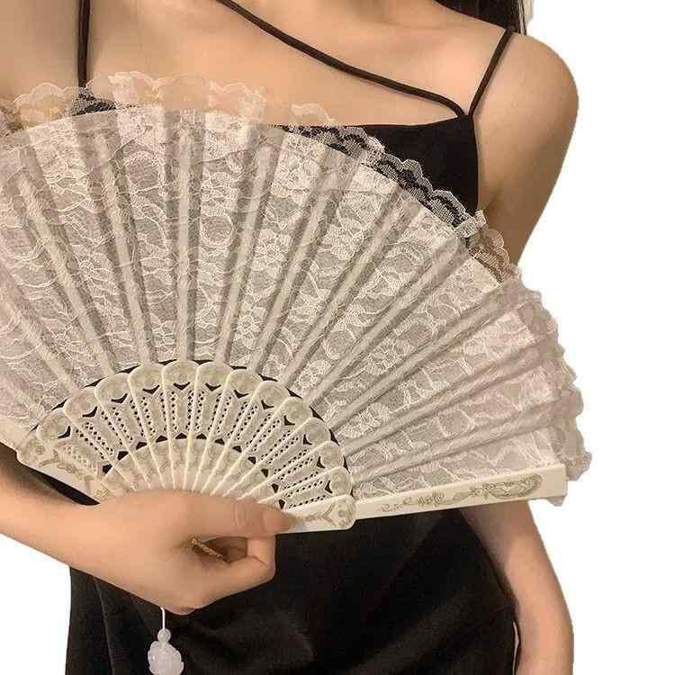 扇子 折りたたみ 新中華風 レトロ アンティーク レース フリル 絹製 ゴシックテイスト 幻想的 クラシックダンス 撮影小物 舞台用 コスプレ ホワイト ブラック