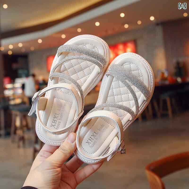 サンダル キッズ 女の子 ベビー オープントゥ プリンセス ラインストーン 夏用 柔らかソール 合成皮革 マジックテープ ローマサンダル 普段使い カジュアル ベージュ ブラック