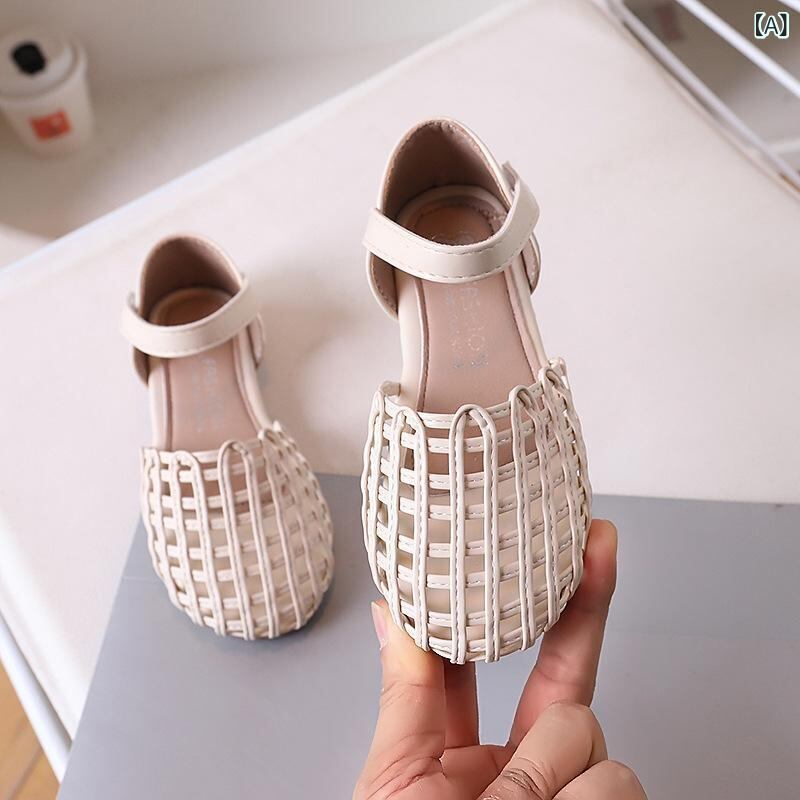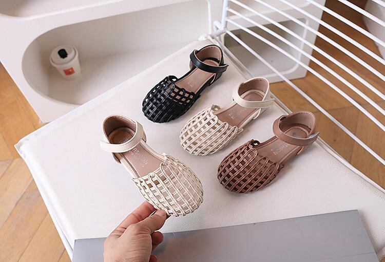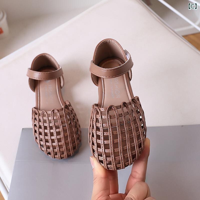 サンダル 女の子 キッズ ベビー 春夏 バックストラップ マジックテープ 韓国風 おしゃれ レトロ 編み込み プリンセスシューズ マイクロファイバーレザー ラバーソール 無地 アイボリー ブラック カーキ