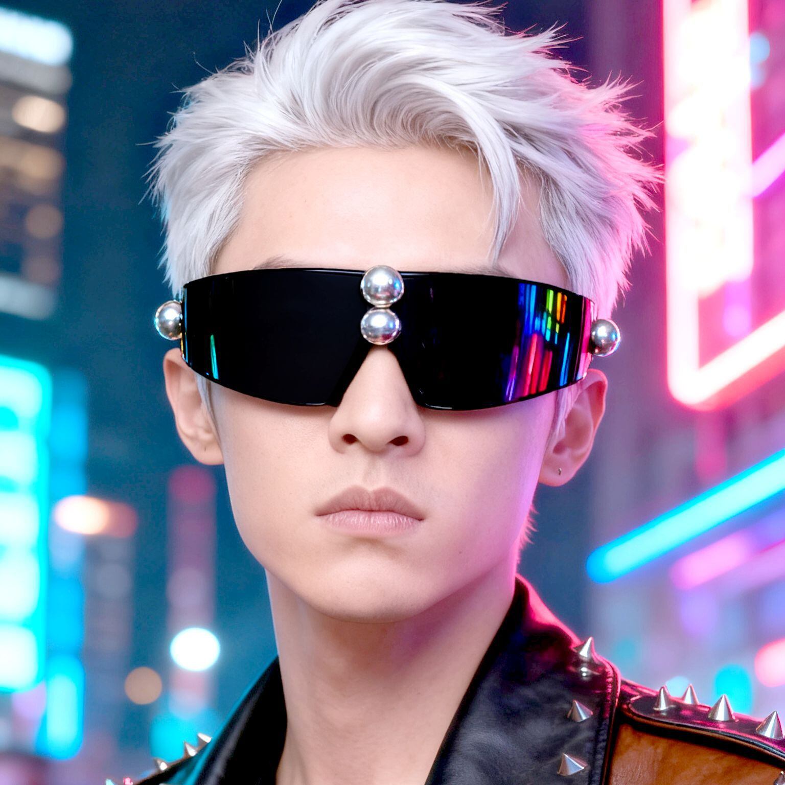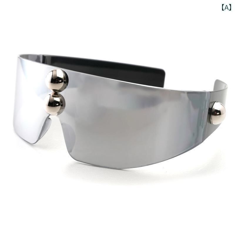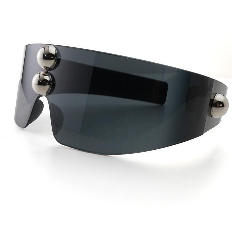 サングラス 男女兼用 ユニセックス 一体型 ラウンドスタッズ フレームレス パンク テック 個性的デザイン パーティー 撮影 アウトドア PC素材 ブラック ミラーレンズ スモークレンズ