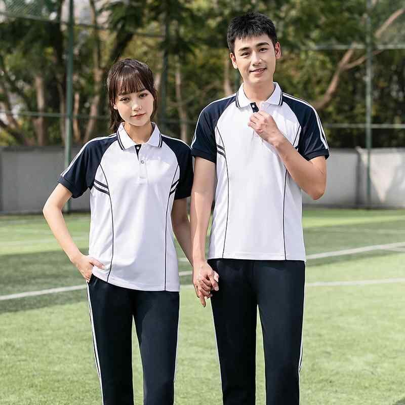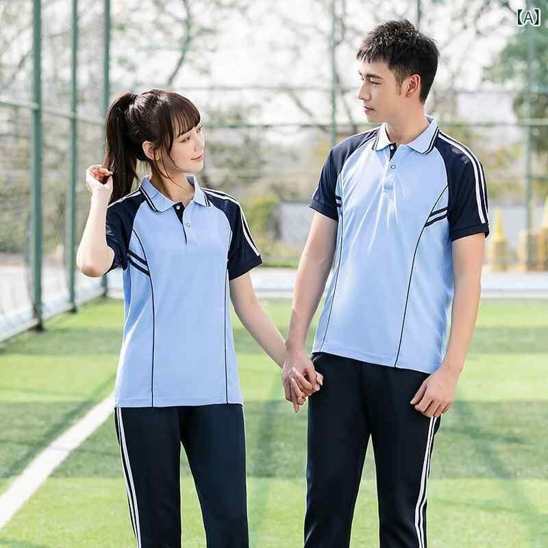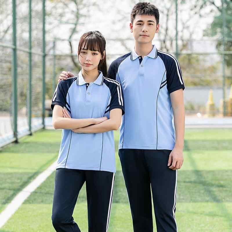 学生服 ユニセックス スクール風 ジャージ 上下セット 半袖 POLO襟 ストライプ柄 スポーツウェア トレーニングウェア 通学 部活 ポリエステル 春夏 ブルー ホワイト