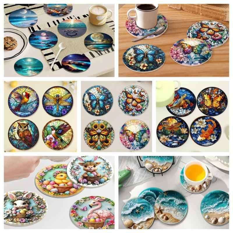 コースター アクリル 円形 平面 蝶 小鳥 星空 花柄 断熱 耐熱 スタンド付き モダン シンプル インテリア雑貨 キッチン雑貨 テーブルウェア おしゃれ リビング オフィス 普段使い 来客用