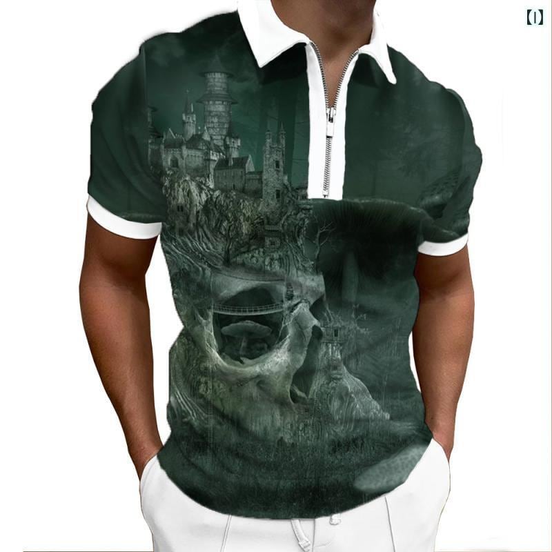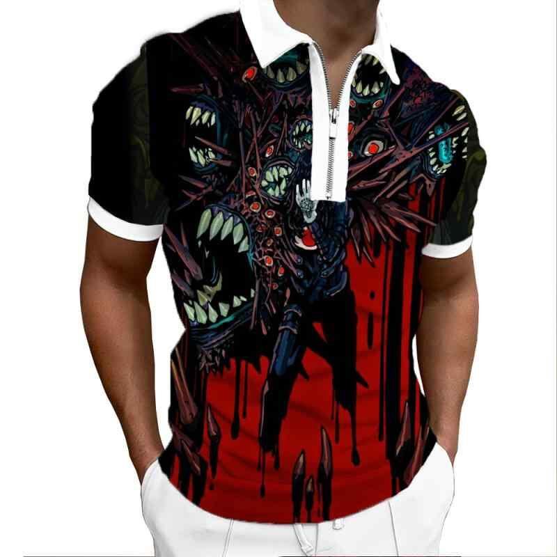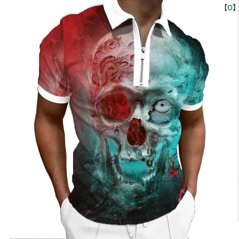 ポロシャツ メンズ ゆったり 半袖 スカル ドクロ 3D デジタルプリント ジップアップ カジュアル アメカジ ストリートスタイル ポリエステル 吸湿速乾 夏 快適 ルーズフィット トップス