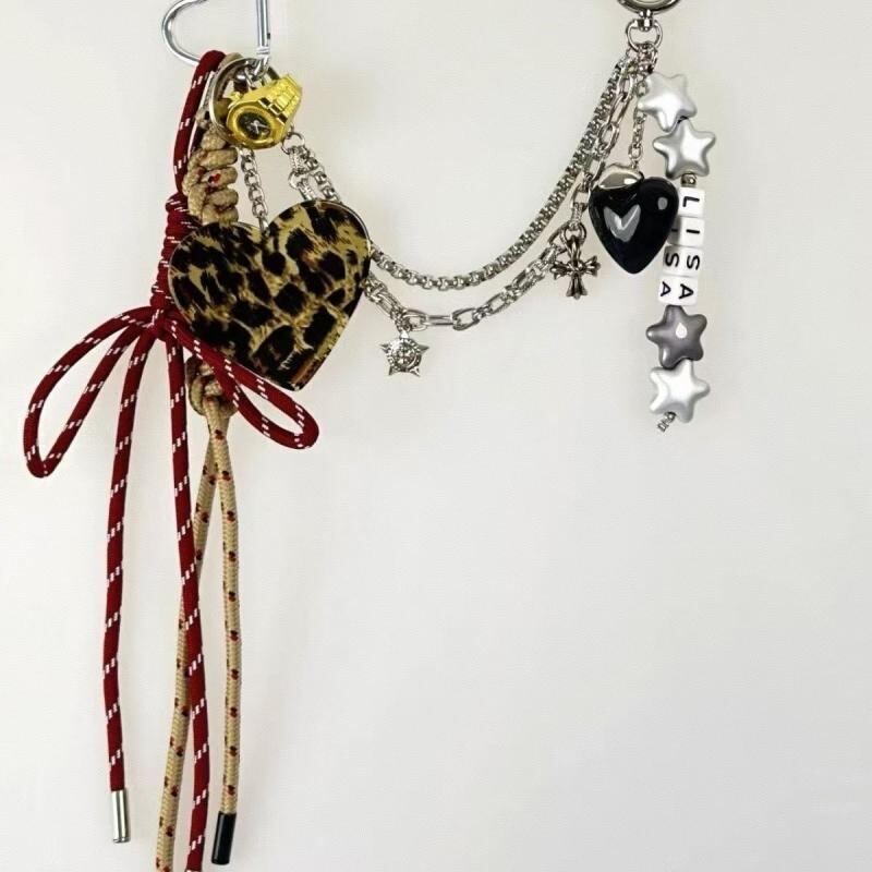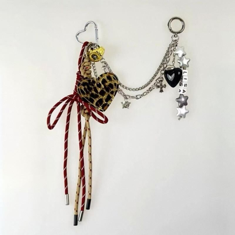 バッグチャーム レディース ヒョウ柄 ハートモチーフ 個性的なデザイン かわいい キーホルダー チャーム 混合素材 アクセサリー 女性用 秋冬