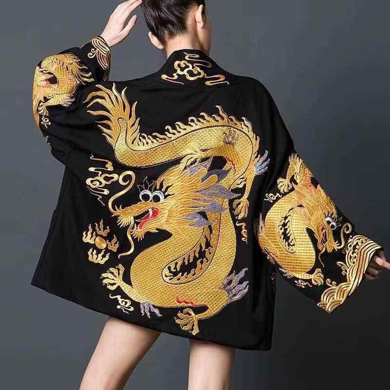 アウター メンズ 中国風 金龍プリント カーディガン 国潮スタイル 民族風 漢服風 舞台衣装 カジュアル リラックス 羽織り ポリエステル 麻混 ブラック 秋冬