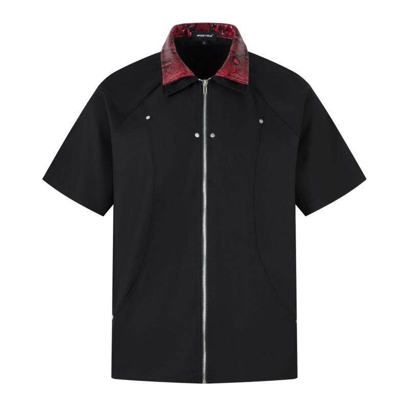 シャツ 男女兼用 ストリートカジュアル アメカジ ヒップホップ 切り替え バイカラー スタッズ装飾 ルーズフィット ビッグシルエット 半袖 ポリエステル 襟付き 春夏