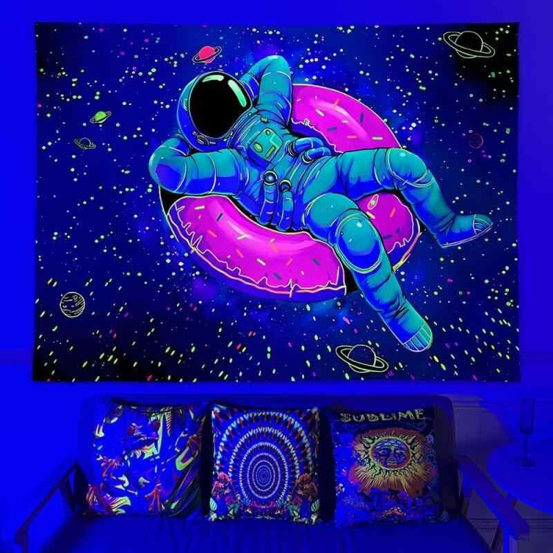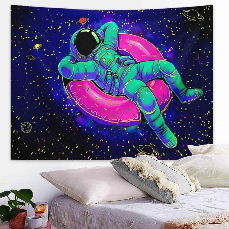 タペストリー 宇宙飛行士 宇宙 月 蛍光 ブラックライト対応 ウォールデコ 壁掛け リビング 寝室 部屋 インテリア 北欧風 幾何学模様 抽象デザイン ポリエステル 長方形