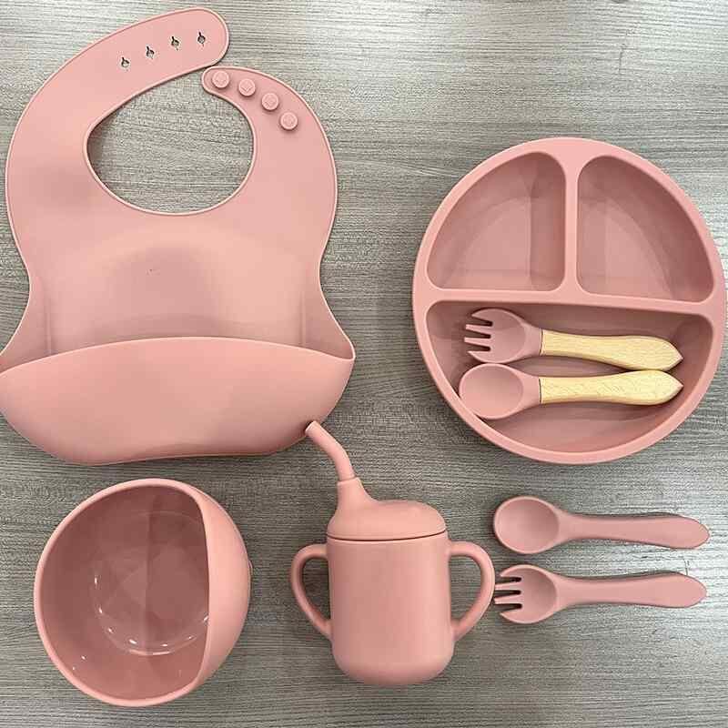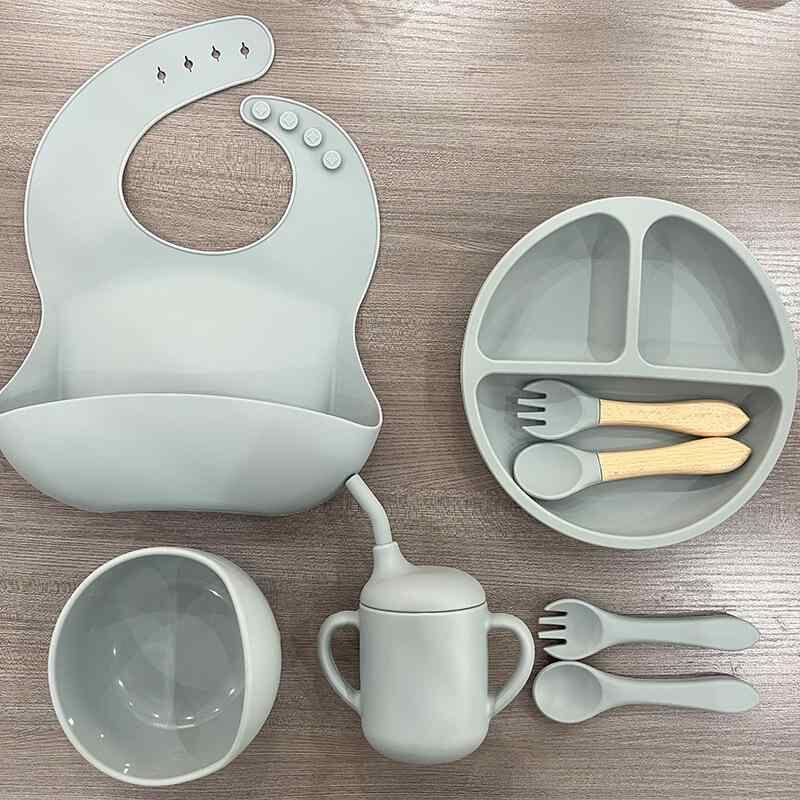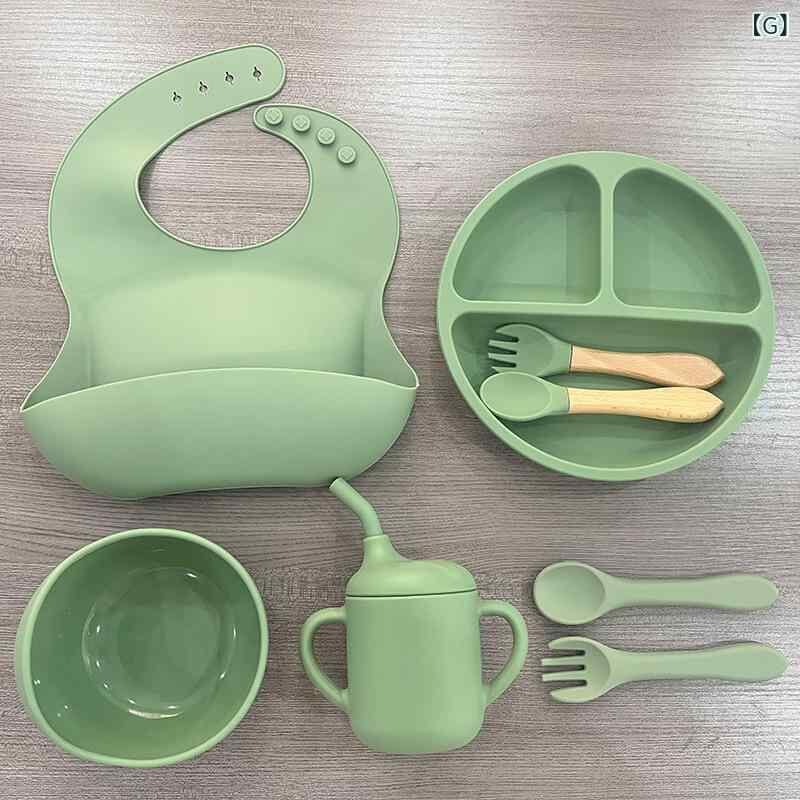 ベビー食器 子供用 8点セット シリコン製 離乳食 出産祝い 仕切りプレート フォーク スプーン 吸盤付きボウル よだれかけ マグカップ 滑り止め