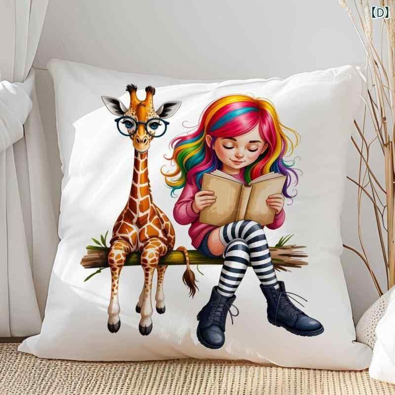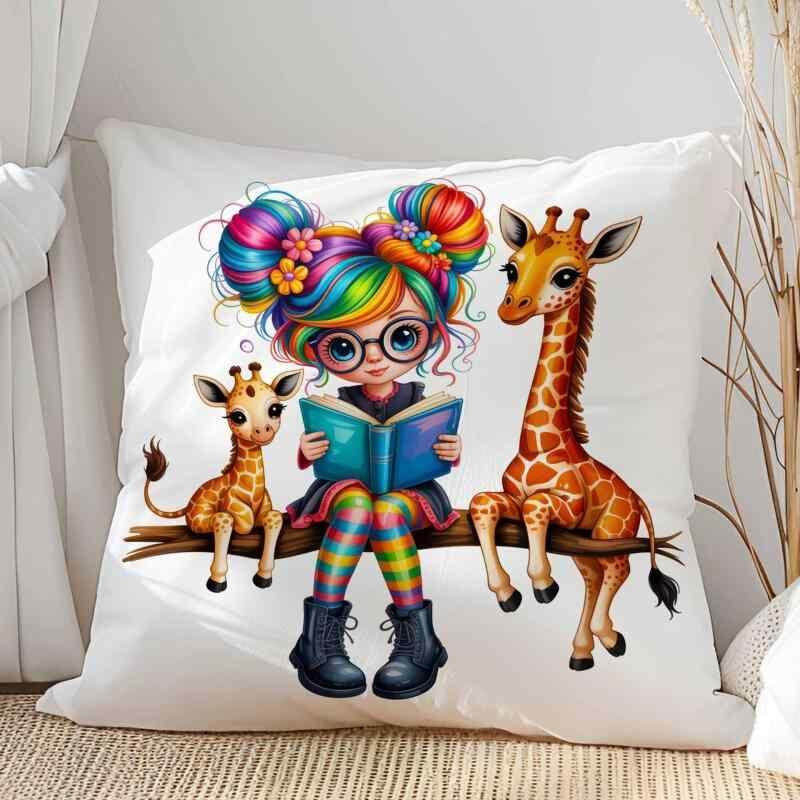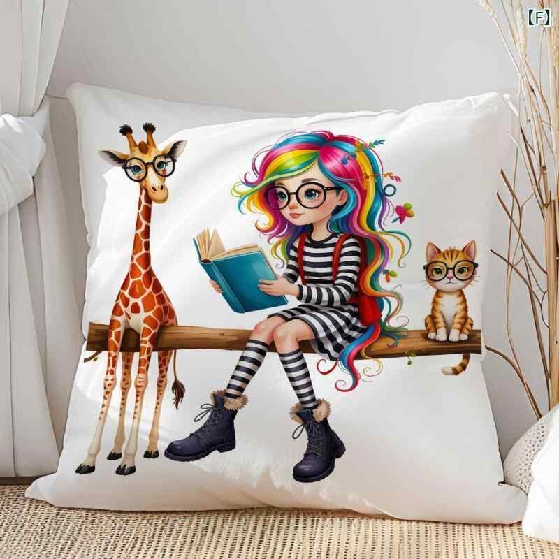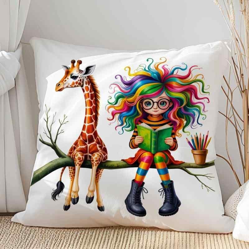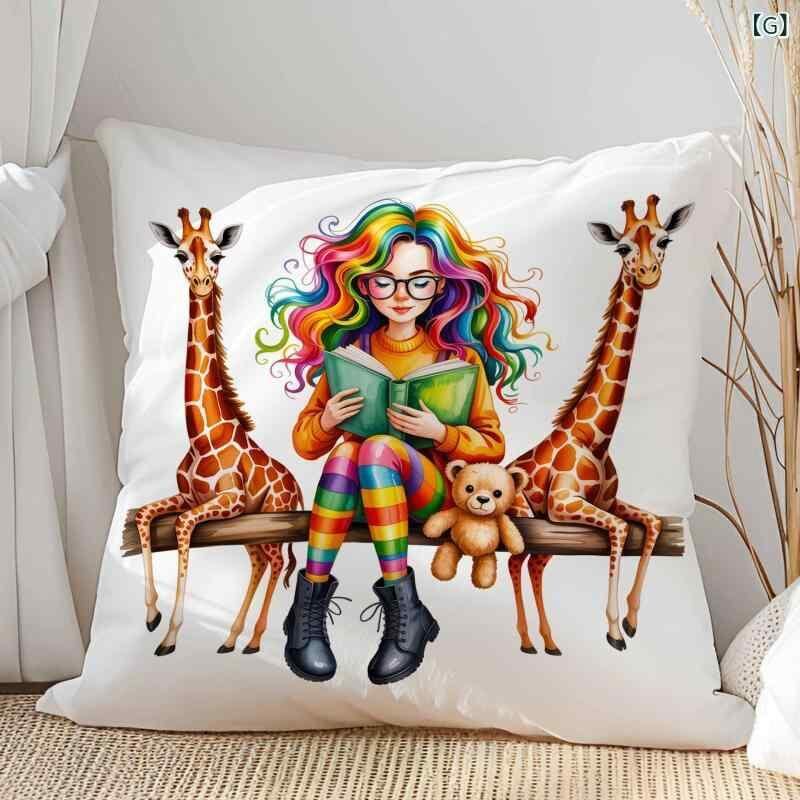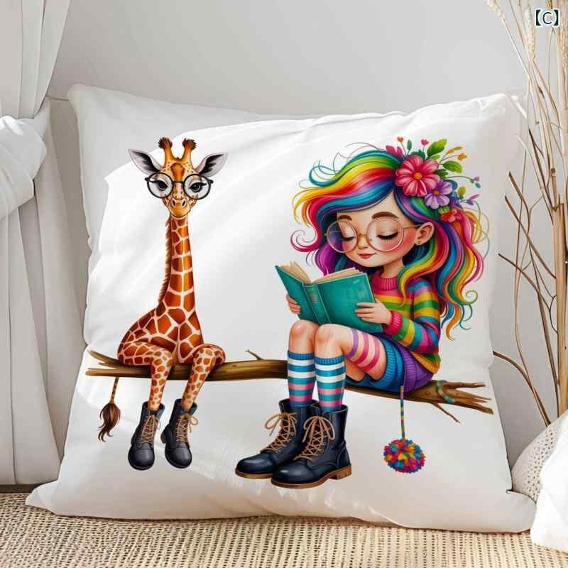 クッションカバー カラフルヘア 女の子 キリン プリント柄 アニマルモチーフ 45cm角 ショートパイル 正方形 ソファ用 リビング 寝室 子供部屋 インテリア 装飾 アクセント おしゃれ かわいい 雑貨
