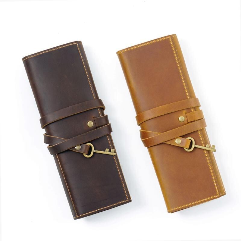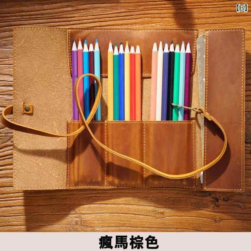 ペンケース ユニセックス 本革 牛革 クレイジーホースレザー ロールアップ式 筆入れ 多機能 文具 ステーショナリー収納 シンプルデザイン ヴィンテージ風 おしゃれ