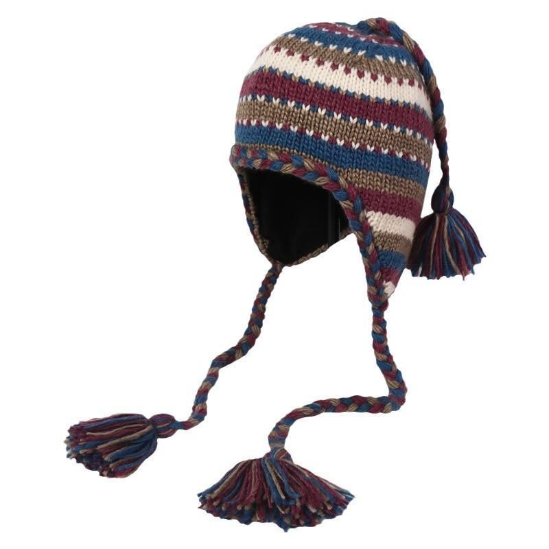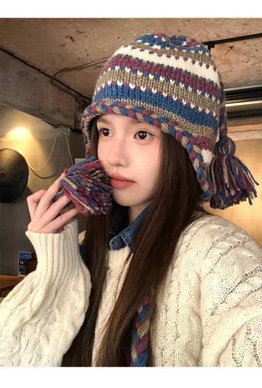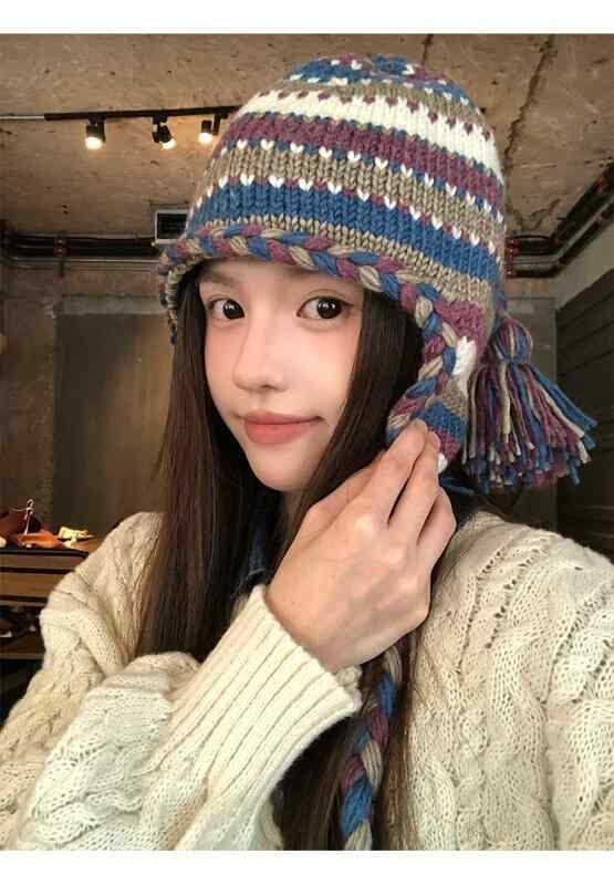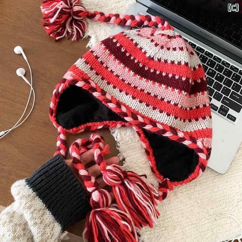 ニット帽 レディース エスニック風 ストライプ バイカラー 手編み 編み込み ウール 秋冬 レトロ カジュアル 小顔効果 耳当て付き