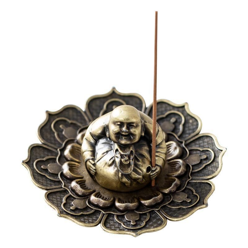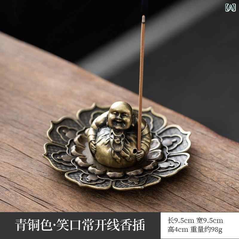 お香立て 弥勒仏 笑顔 仏像 レトロ アンティーク 香炉 銅合金製 インセンスホルダー 自宅 室内用 スティック香 渦巻き香対応 香皿 ブロンズカラー