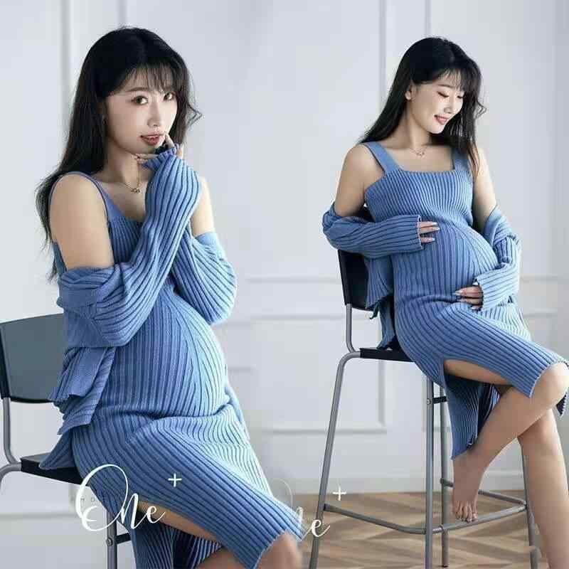 マタニティドレス 妊婦用 撮影用 マタニティフォト 記念写真 エレガント ロマンティック ブルー カーディガン ワンピース 羽織り 2点セット スタジオ撮影 コットン 綿素材