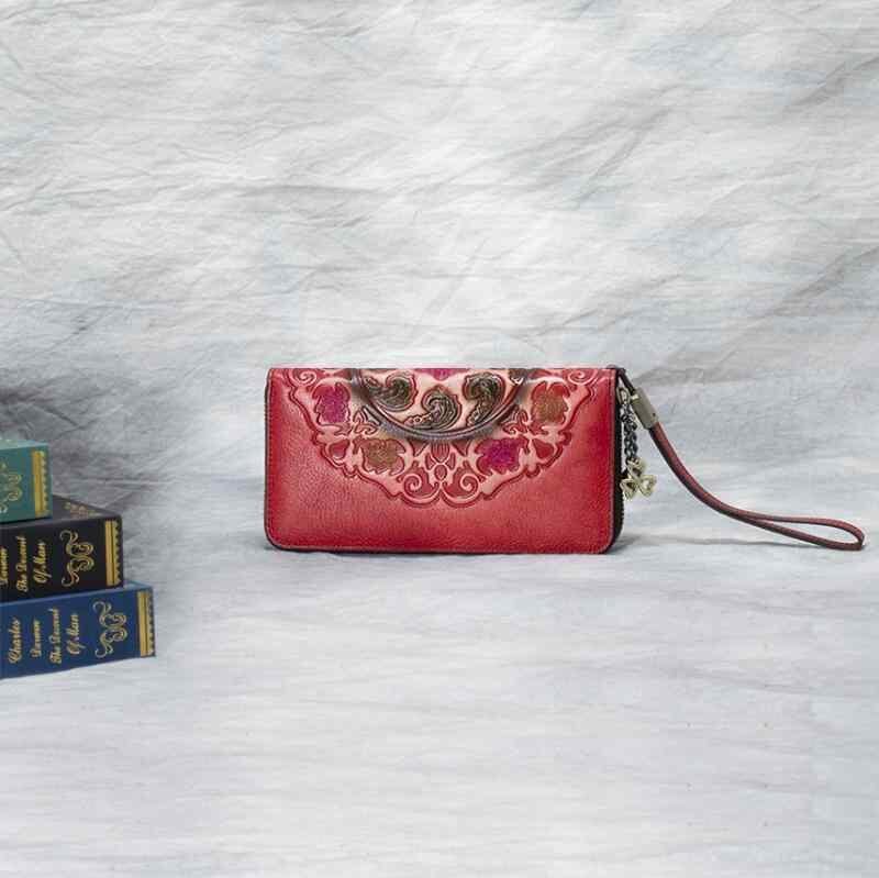 長財布 レディース 本革 牛革 レトロ 型押し 花柄 多収納 大容量 リストレット クラッチバッグ 普段使い 欧米風 耐久性 春夏 ブラック ブラウン レッド