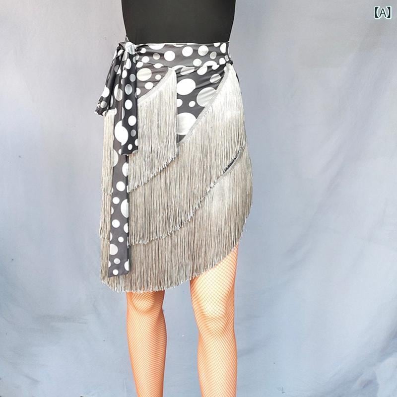 ラテンダンス レディース スカート 巻きスカート風 フリンジ ヒップスカーフ 再生繊維 スパンデックス 伸縮性 動きやすい 練習着 レッスンウェア 発表会 舞台衣装 社交ダンス 大人用 グレー 水玉模様 ゼブラ柄 ショート丈 アシンメトリー
