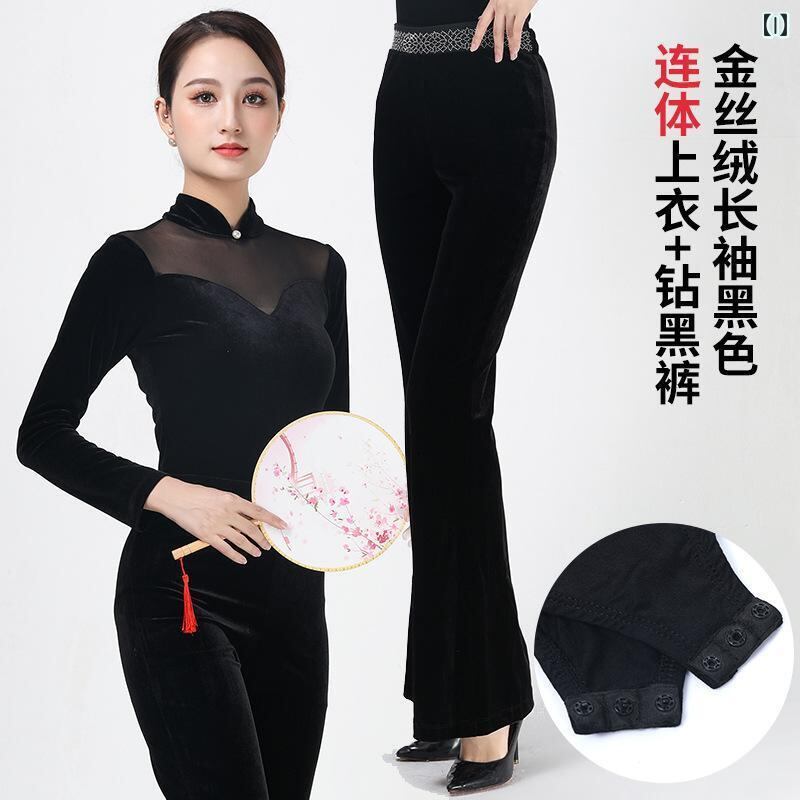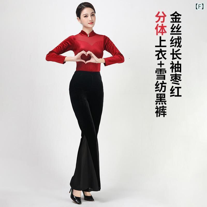ダンスウェア レディース ベロア セットアップ インストラクター 講師用 フィットネスウェア トレーニングウェア 秋冬 上下セット レッスン着 発表会 フォーマル ワイドパンツ フレアパンツ エレガント 黒 赤 ポリエステル