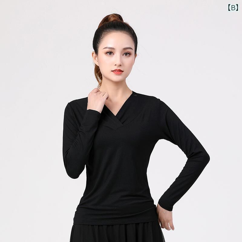 トップス レディース ダンス 秋冬 Vネック 長袖 モダール素材 伸縮性 吸湿性 黒 体型カバー レッスン 練習 モダンバレエ ヨガ フィットネス トレーニング