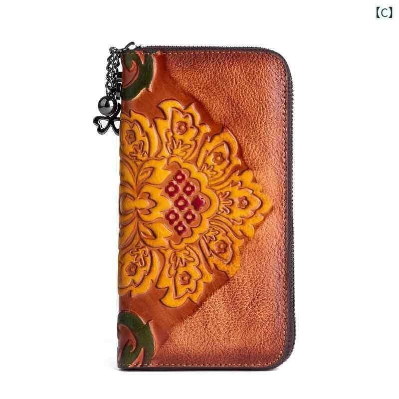 長財布 レディース 本革 牛革 植物タンニンなめし フルグレインレザー レトロ ヴィンテージ加工 型押し 花柄 ファスナー開閉 ロングウォレット クラッチバッグ デイリーユース