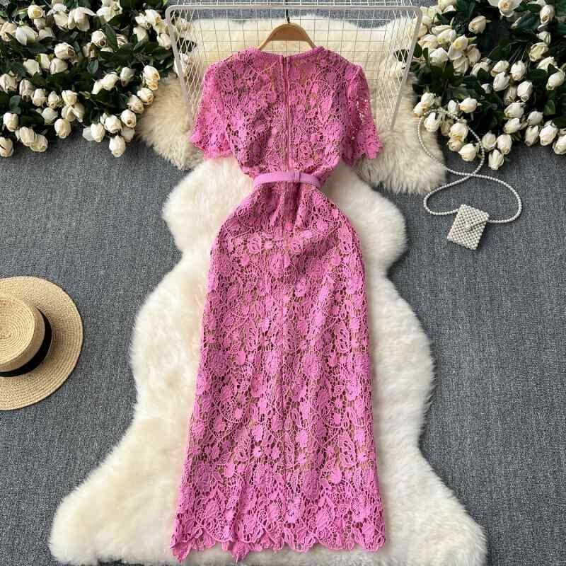 ワンピース レディース 女性用 上品 エレガント きれいめ スクエアネック メタルボタン レース ミディ丈 Aライン フィット 半袖 オケージョンドレス パーティー 通勤 ピンク ブラック 春夏