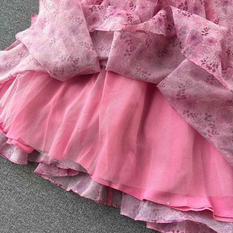ワンピース レディース 宮廷風 チュール切り替え パフスリーブ 花柄 ウエストマーク 細見え Aライン ハイウエスト ミモレ丈 ローズレッド テンセル 春夏 ラウンドネック お出かけ ドレス