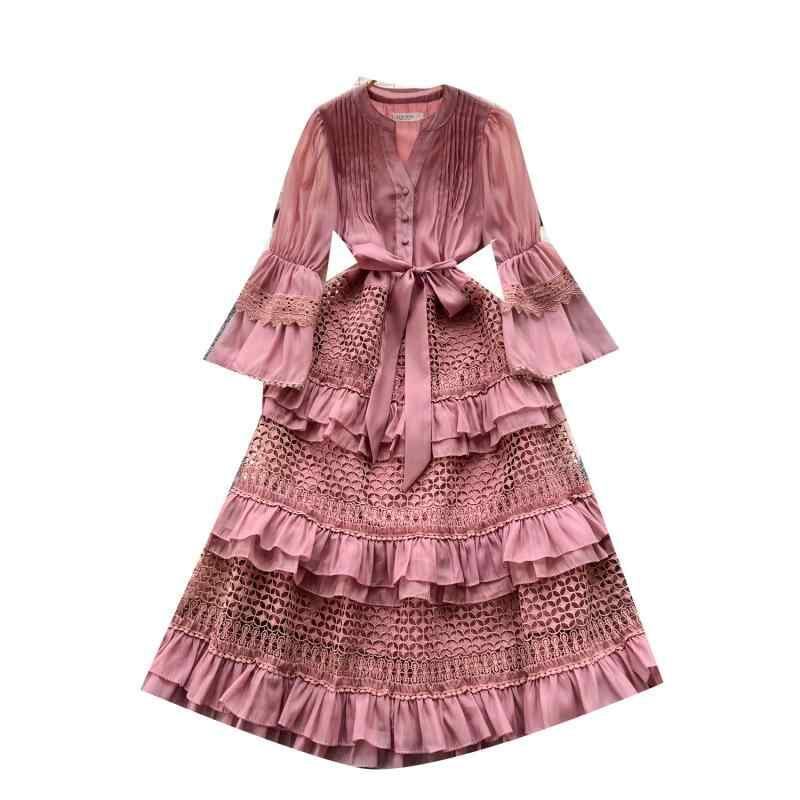 ワンピース レディース フレンチエレガント フェミニン フレア袖 透かし編みレース切り替え ティアードデザイン ウエストシェイプ 着痩せ効果 上品 Aライン ハイウエスト ロング丈 きれいめ 通勤スタイル