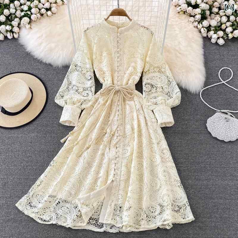 レディース ワンピース レトロ 宮廷風 水溶性レース ランタンスリーブ ハイウエスト Aライン フレア ロング丈 エレガント 上品 フェミニン スタイルアップ 通勤 オフィス デート アプリコット ブラック