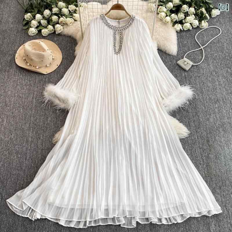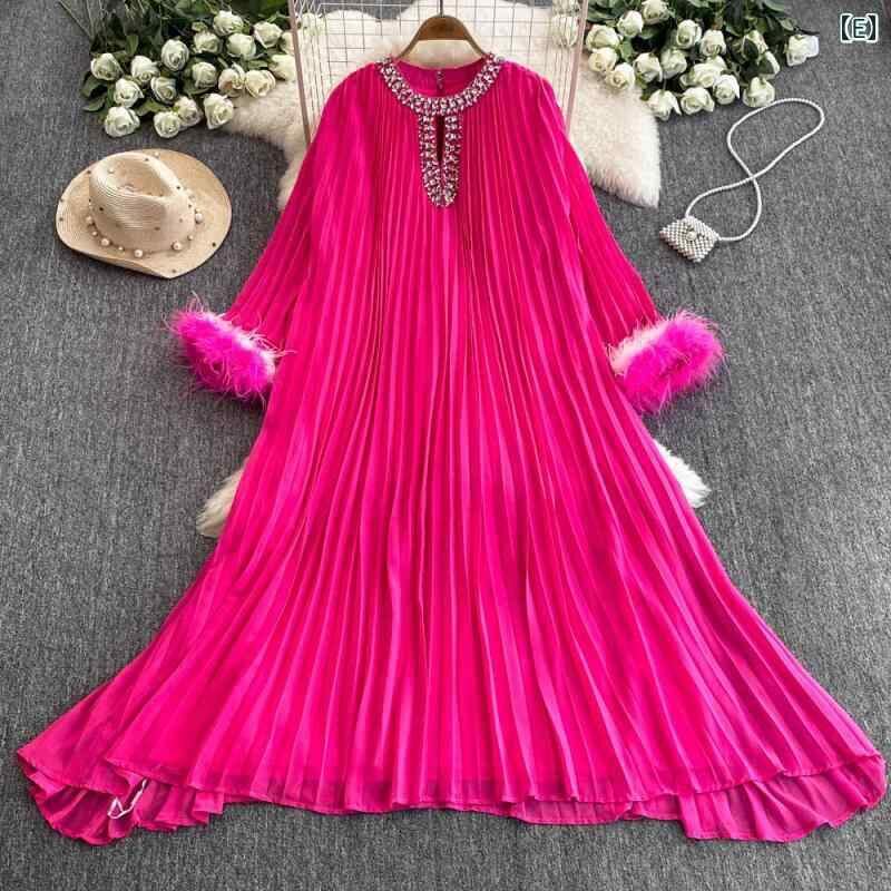 ワンピース レディース 秋冬 韓国 シック フレンチレトロ 上品 ラウンドネック ゆったり ロング丈 フレアスリーブ プリーツ ラインストーン Aライン アシンメトリー 通勤 オフィス カジュアル ドレス