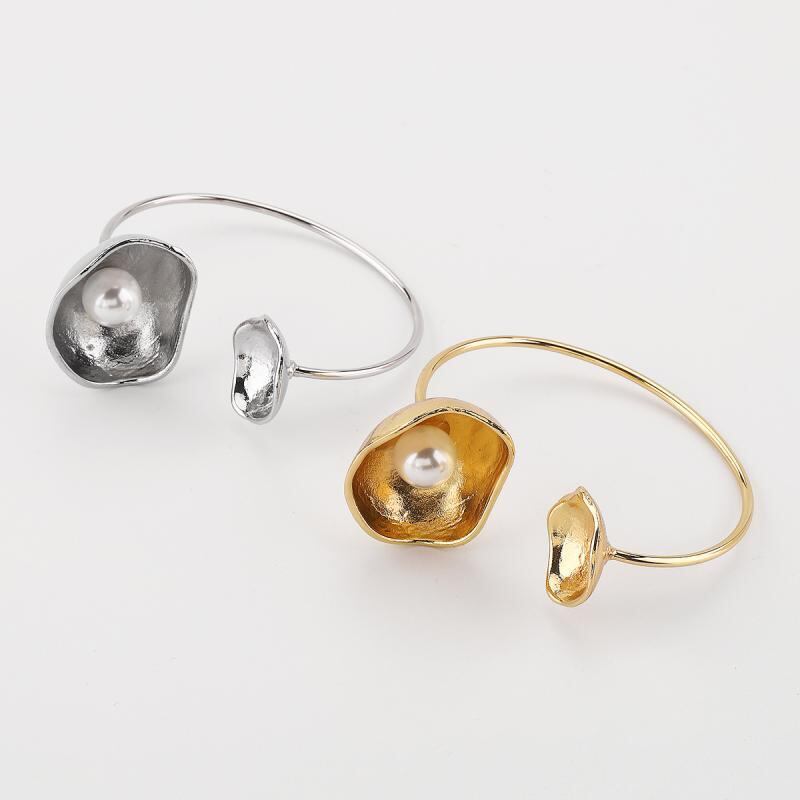 レディース ブレスレット レトロ ヴィンテージデザイン 不規則 オープンバングル カフリング パール フラワーモチーフ ボウル型 シンプル 高級感 ライトラグジュアリー 電気メッキ加工 合金製 ゴールド シルバー