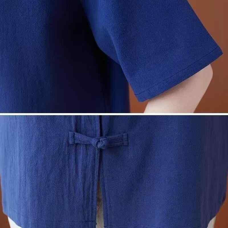 太極服 メンズ 男性用 半袖 新中国風 唐装 レトロ ヴィンテージ 中華風 中医館 ユニフォーム 作業着 綿麻 麻 リネン ナチュラルホワイト ネイビー 夏用